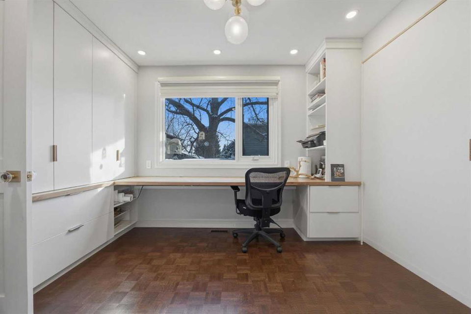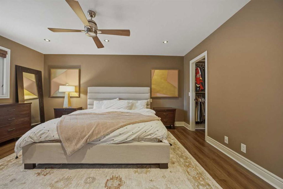 Kelvin Grove – 1136 Kildonan Place SW: Situated on a quiet cul-de-sac in the established community of Kelvin Grove, this fully developed two-storey home offers a traditional layout with over 2,900 sq ft of total living space, 3 + 1 bedrooms, 3.5 bathrooms, and a heated, oversized, attached double garage. The main floor has tons of natural light and features hardwood/parquet flooring throughout. The bright west-facing living room is separated from the family room by a bevelled glass partition wall. The family room features a wood-burning brick fireplace, built-in shelving, and French doors leading to the generous backyard, creating a seamless indoor-outdoor flow. The updated kitchen is thoughtfully designed with granite countertops, abundant cabinetry, a gas range, a custom hood cover, a built-in oven, and a refrigerator. A bay window overlooks the backyard, while the adjoining breakfast nook provides a second set of French doors for added access to the outdoor space. The main floor den includes a built-in desk with storage, and connects conveniently to the mudroom, complete with a custom bench, hooks, and a closet. A 2-piece powder room, spacious front entry, and separate side entry off the kitchen complete this level. Upstairs, you will find new luxury vinyl plank flooring throughout. The generous primary suite features a custom walk-in closet with ample hanging space and drawers, along with a 5-piece ensuite with dual sinks, a glass-and-tile shower with a bench, and a jetted tub. Two additional bedrooms, each with custom closet systems, and a 4-piece main bathroom with linen storage complete the upper level. The lower level is fully developed and includes a large recreation room with a gas fireplace and flexible space for a games area, a fourth bedroom with a 3-piece ensuite, a laundry room with sink and folding counter, and a spacious storage closet. Situated on a quiet cul-de-sac, this home rests on an oversized 7,492 sq ft lot without a back lane. The generous backyard is private and fully fenced, featuring mature landscaping, a spacious patio, and a storage shed, offering the perfect setting for entertaining or family enjoyment. Kelvin Grove is a sought-after neighbourhood known for its mature tree-lined streets and excellent amenities. Enjoy close proximity to green spaces, Chinook Centre, Rockyview Hospital, Heritage Park, Chinook Park School, Henry Wisewood High School, and convenient access to Glenmore Trail, Elbow Drive, Crowchild Trail, and Stoney Trail. This is a wonderful opportunity to own a home that offers room to live, grow, and entertain in one of Calgary’s most desirable communities.