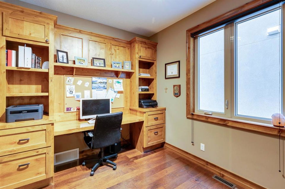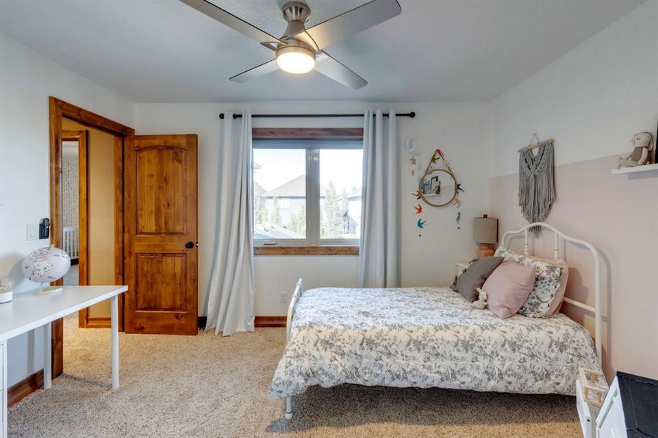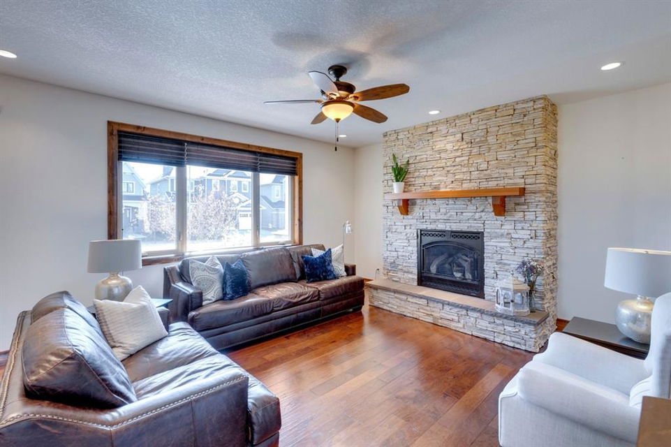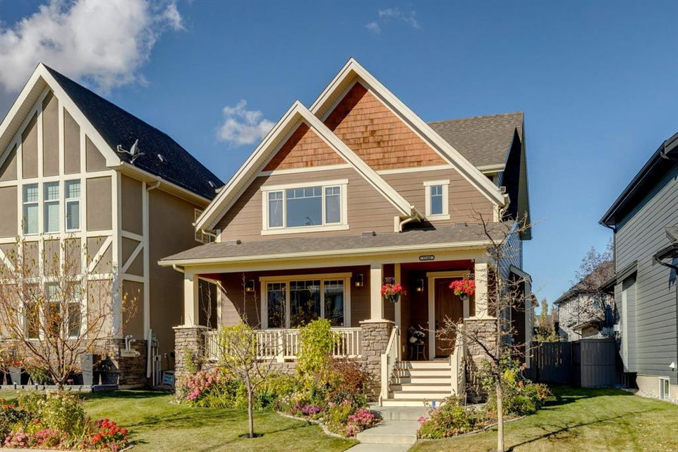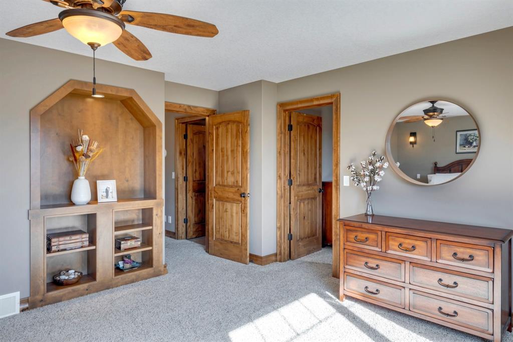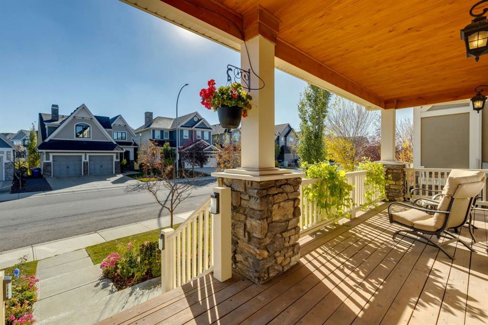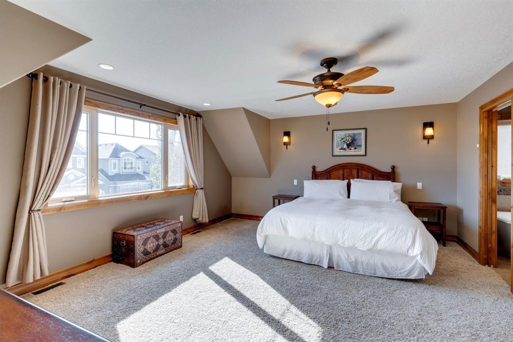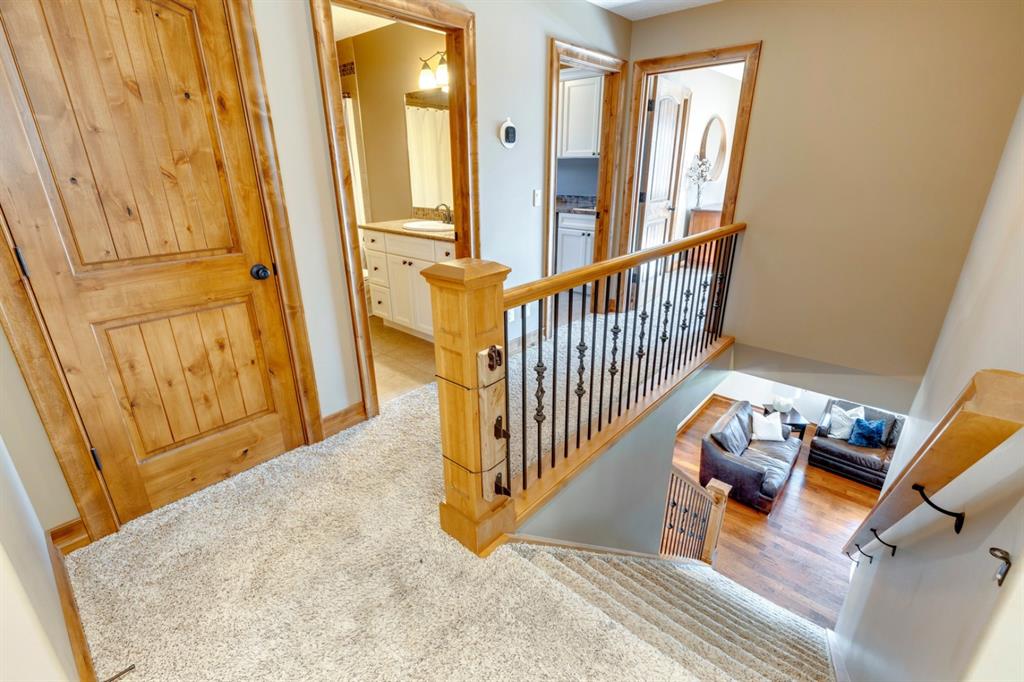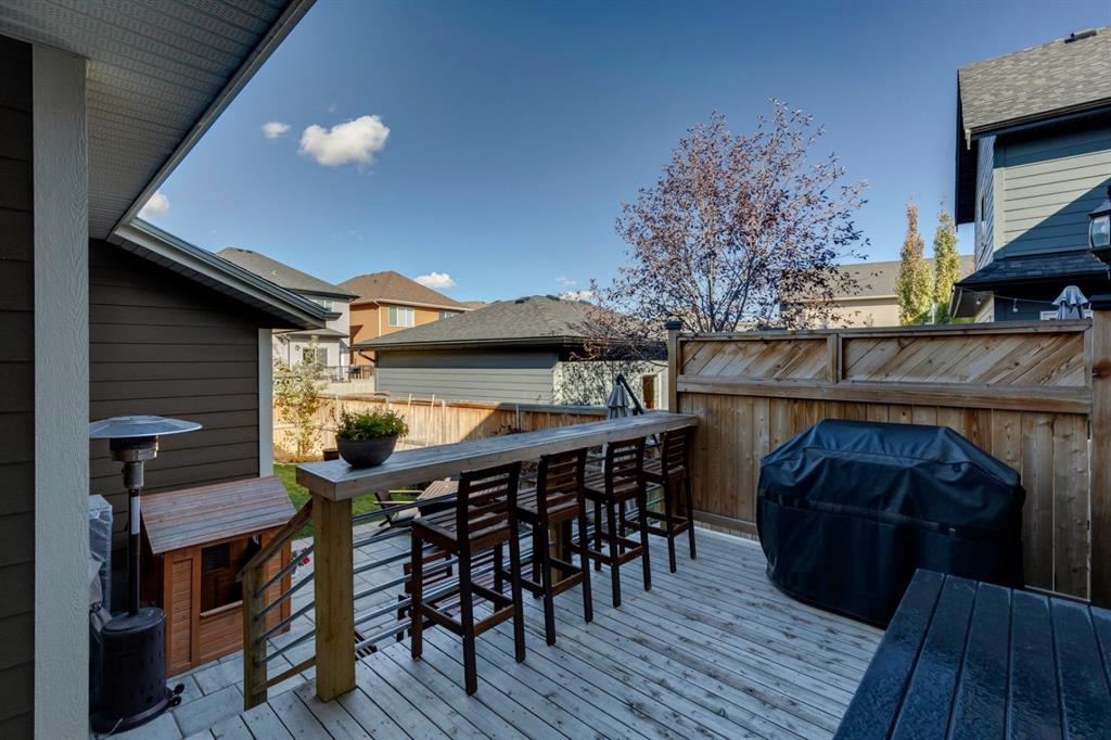Coopers Crossing – 1146 Coopers Drive SW: Welcome to this extraordinary, custom-built 2,501 square foot home in the prestigious community of Coopers Crossing. This mountain-style home with 3 + 2 bedrooms, 3.5 bathrooms and a fully developed lower level. The warm and inviting main floor showcases the home’s style with a beautiful stone surround gas fireplace in the living room opens to the large dining area and kitchen. The bright and modern kitchen features stainless steel appliances, quartz countertops, island with an eating bar; large walk-in pantry; a home office with custom cabinetry and built-in desk; a powder room and mudroom with built-in lockers. From here enter the oversized, heated, double car garage with additional workshop & storage areas. The upper floor’s impressive & bright primary bedroom features grand windows, a large walk-in closet & 5-piece ensuite. The upstairs includes two additional large bedrooms with walk-in closets and a spacious bonus room; a 4-piece main bathroom and a laundry room with sink. The fully developed 1,048 square foot lower level features a family room with built-in gas fireplace, wet bar with beverage fridge and dishwasher; 2 additional bedrooms and 3-piece bathroom. Step outside and spend time on the sunny front porch surrounded by an English garden with an easily programmable irrigation system. In the fully fenced, landscaped, low-maintenance backyard enjoy; the deck with eating bar & BBQ area and lower stone patio for dining & entertaining. This immaculate home shows pride of ownership, quality of construction and is steps away from parks, playgrounds, schools and a short drive to Calgary. Quick Possession available. Call for more info!