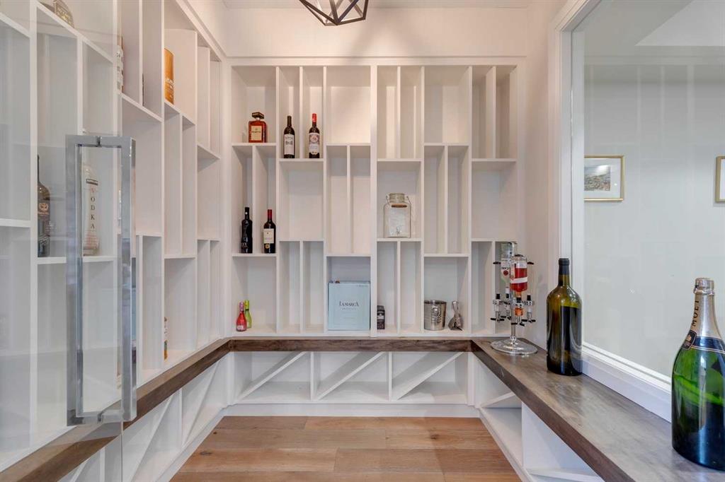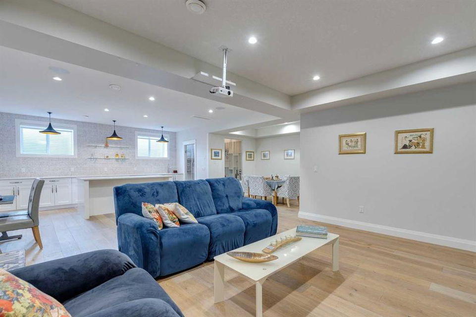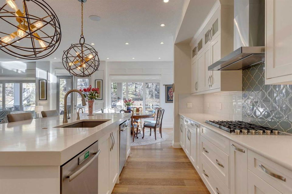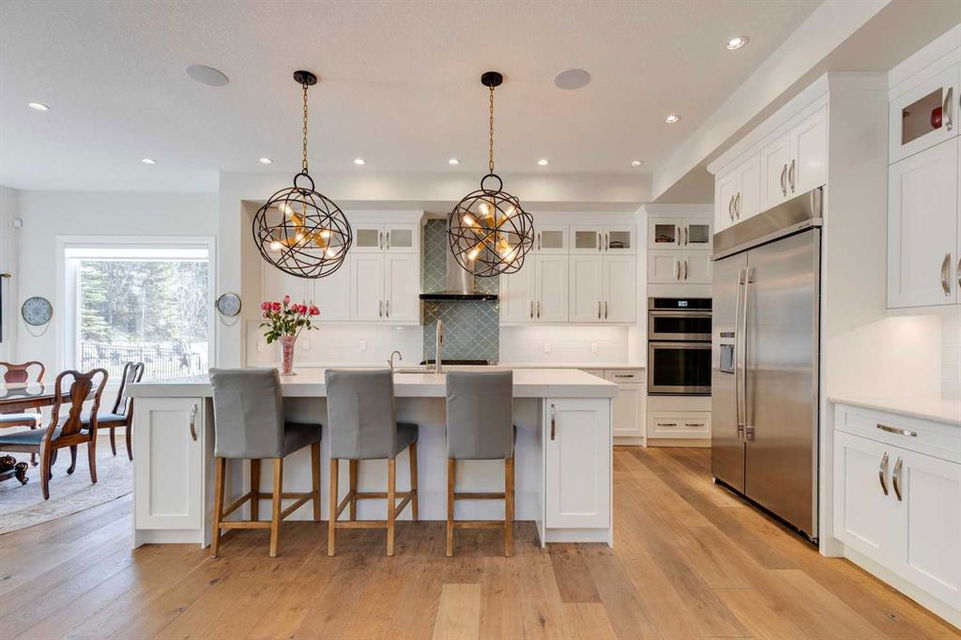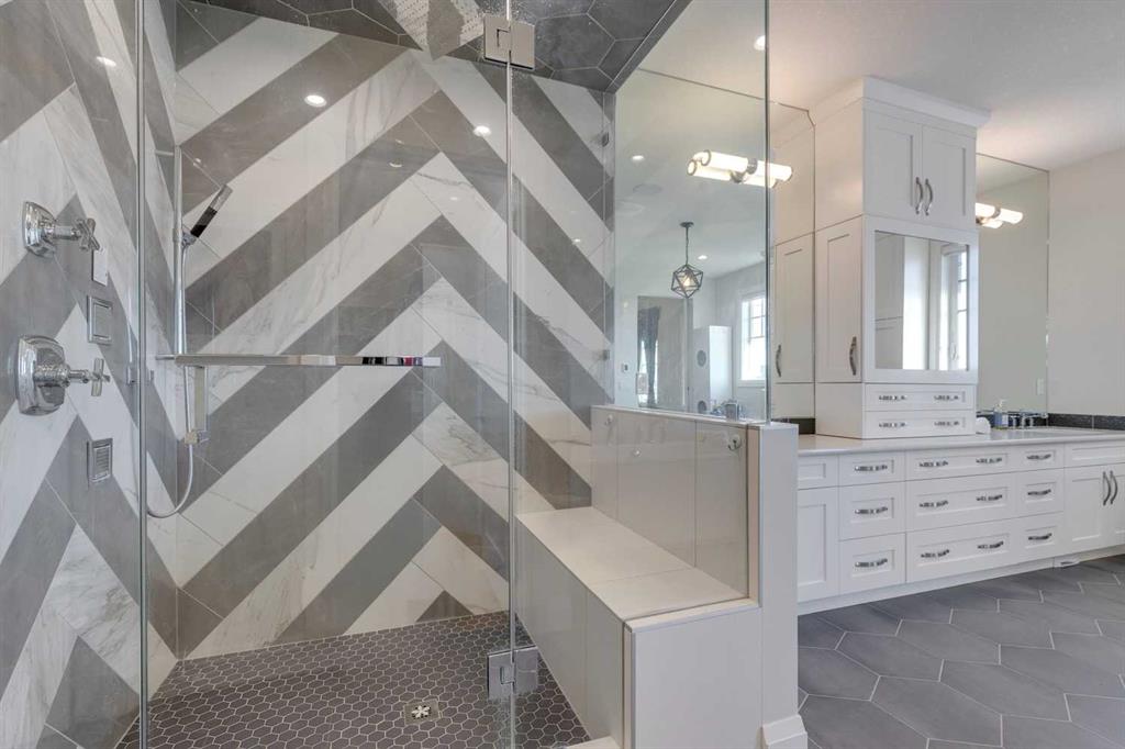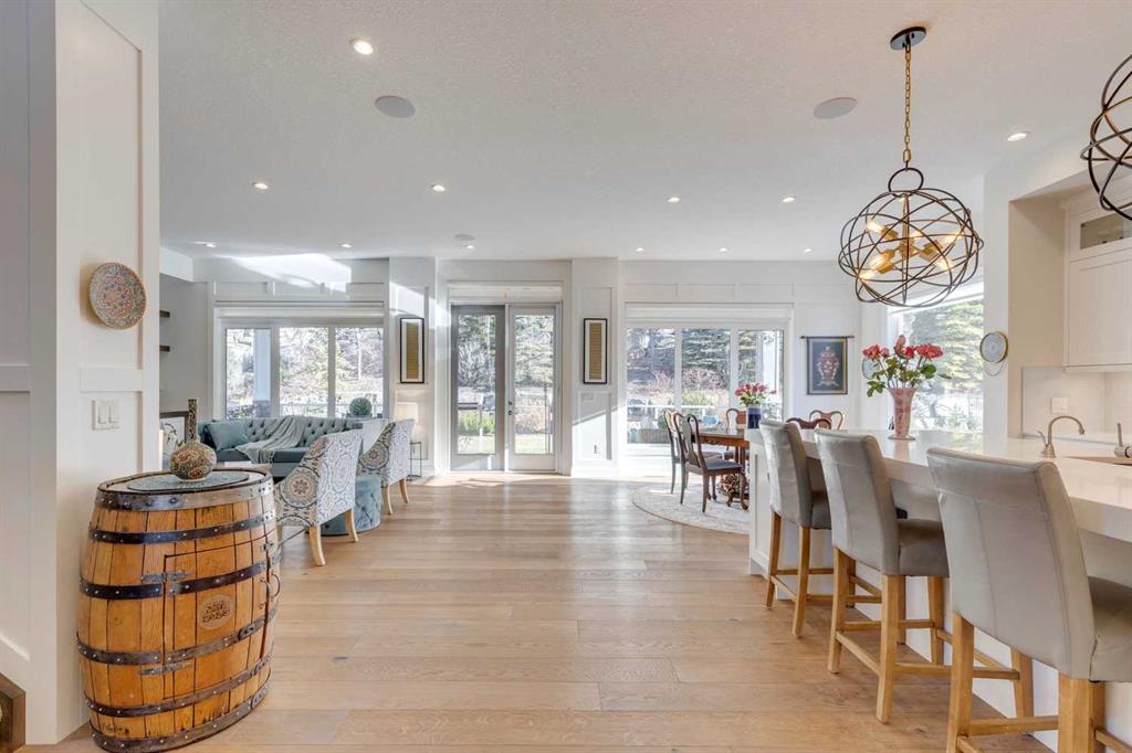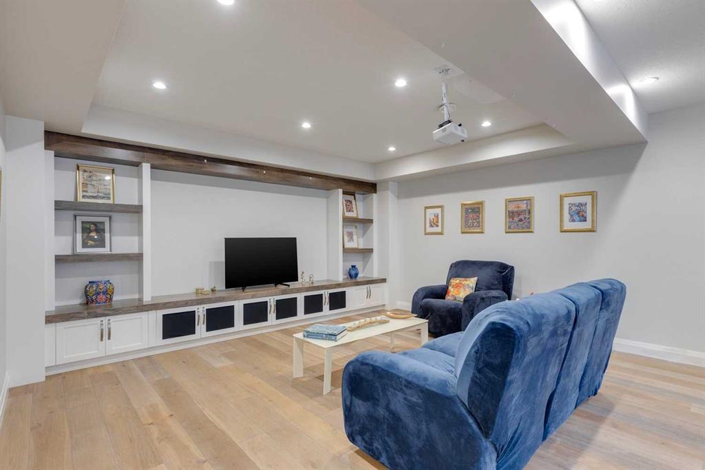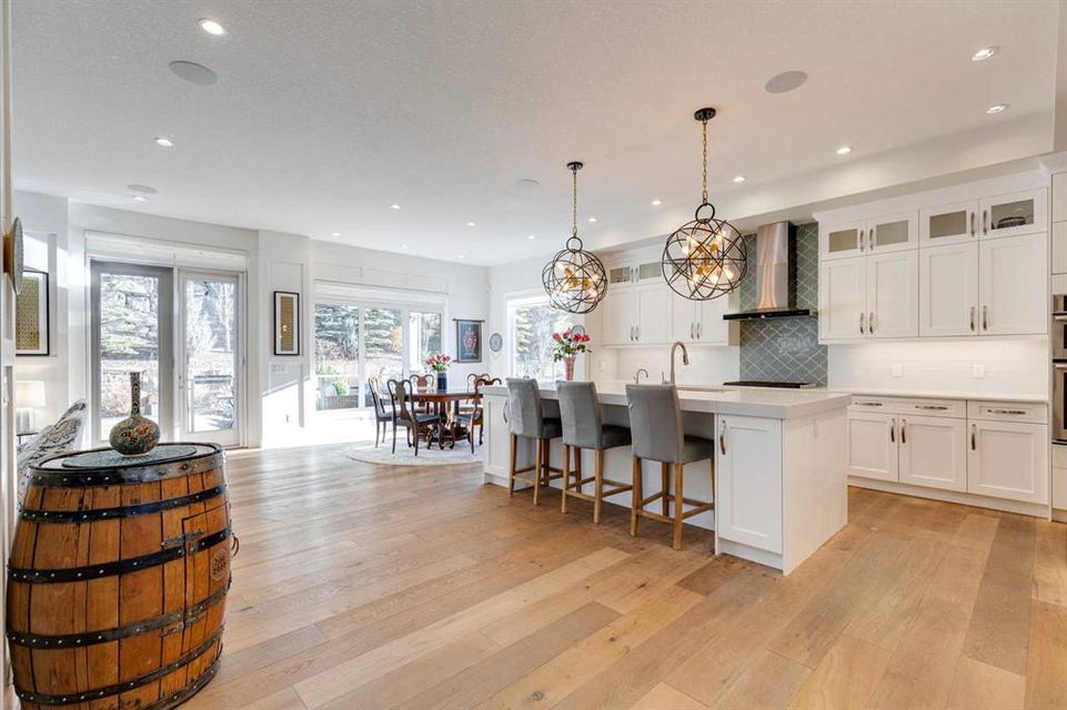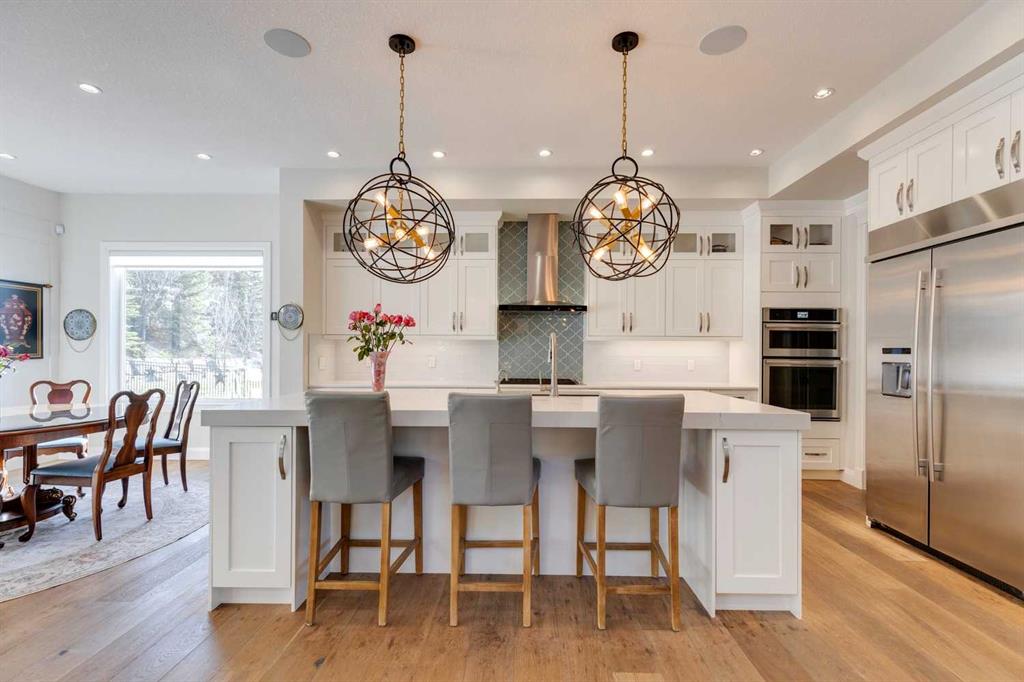 Watermark at Bearspaw – 130 Hillside Terrace: Welcome to this fully developed estate property built by Prominent Homes in the coveted community of Watermark at Bearspaw. Located on a quiet street, this stunning home offers nearly 5,000 sqft of total living space with 5 bedrooms, 4.5 bathrooms, and a heated attached triple-car garage. The bright, open main floor features hardwood throughout and a spacious front entry. The gourmet central kitchen includes quartz countertops, a large island with seating for three, high-end JennAir stainless steel appliances – a gas cooktop, chimney hood fan, dual dishwashers, wall oven, microwave oven, and built-in refrigerator – plus a Silhouette beverage fridge. The separate spice kitchen offers additional prep space with built-in cabinets, a gas cooktop, and a hood fan. Designed for both everyday living and entertaining, the main floor has a generous breakfast nook with space for a large table, a great room with built-ins and a gas fireplace, and a front flex room with barn doors – ideal as an office or sitting room. A 2-pc powder room and well-organized mudroom with a bench, hooks, and plenty of storage complete the level. Upstairs, the southwest-facing primary suite features a large walk-in closet with custom built-ins and a luxurious 5-pc spa ensuite with heated floors, a tiled glass shower, a freestanding soaker tub, dual sinks, and a private water closet. Three additional bedrooms, each with walk-in closets, including one with a private 4-pc ensuite – share the upper level. You will also find a central bonus room with skylight, a 5-pc main bath with double sinks, and a convenient laundry room with sink, folding counter, and linen storage. The fully developed lower level is perfect for hosting, offering a wet bar and island, dishwasher, and beverage fridge, plus a wine room, spacious family room with built-ins, recreation area, a 4-pc main bathroom, and a fifth bedroom with a walk-in closet. Additional features of this home include an alarm system, 2 A/C units, 2 furnaces, speakers throughout the home, solar panels, 220 in the garage for EV charging, and an underground sprinkler system. Relax on the front veranda while the kids play, or escape to the beautifully landscaped backyard with a covered deck. Watermark at Bearspaw is an award-winning luxury estate community featuring a central plaza with a pavilion, BBQs, fire pit, NBA-sized basketball court, outdoor kitchen, and more. Residents enjoy paved pathways winding through ponds, streams, and parkland. Ideally located just minutes from Calgary’s city limits with quick access to Crowchild Trail, LRT/transit, schools, parks, recreation, and the mountains. This exceptional home is perfect for multi-generational or extended families. Call for more information!