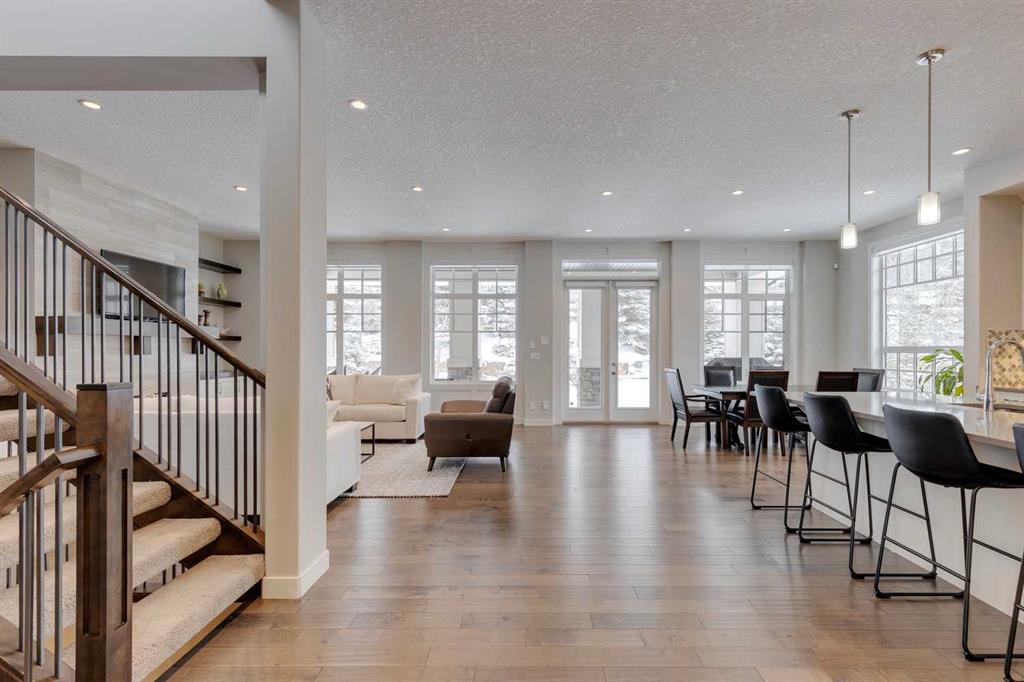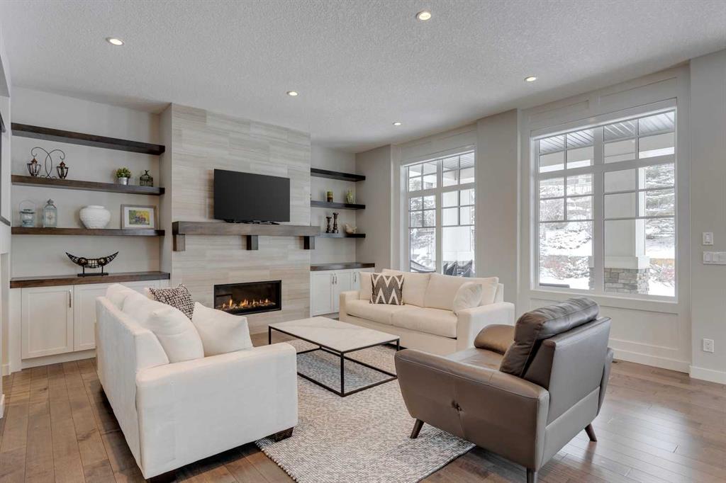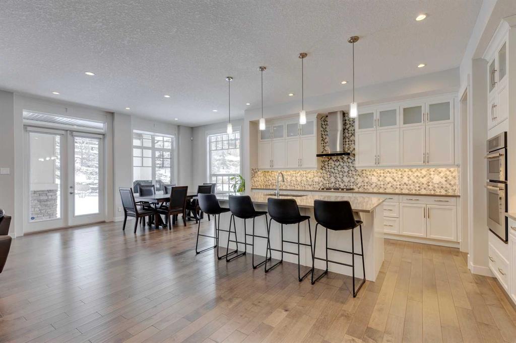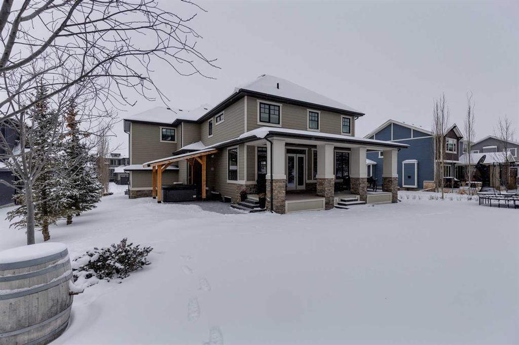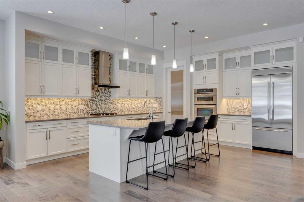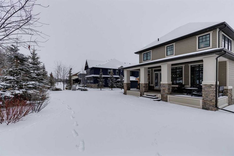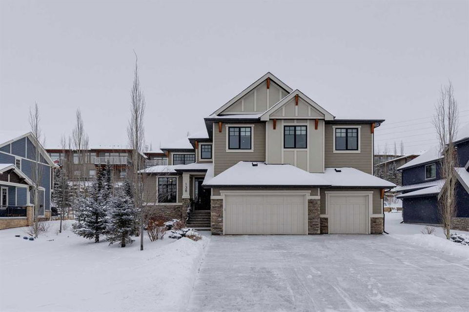 Watermark at Bearspaw – 138 Hillside Terrace: Welcome to this well-maintained home in desirable Watermark at Bearspaw. Situated on a quiet street featuring over 4,500 sq ft of development, 4 + 1 bedrooms, 4.5 bathrooms, a fully developed lower level, and an attached triple car garage. The open and bright main floor has a gorgeous kitchen and breakfast nook, great room, and office/flex room. The kitchen has quartz countertops, a central island with seating for 4, stainless steel appliances, including a gas cooktop, chimney hood fan, and dishwasher, plus built-in appliances that include; a refrigerator, microwave oven, and wall oven. The open concept floor plan features a breakfast nook that provides plenty of space for a large table; a great room with built-in shelves and a gas fireplace with a mantle; a flex room with barn doors which is currently being used as an office/computer room; a 2 pc powder room, a large walk-in pantry and a mud room with L-shaped bench, hooks and ample storage space. The upper level features a bright primary bedroom with a 5 pc ensuite including dual sinks, a tiled glass shower with bench and a soaker tub; a walk-in closet with built-in shelves, rods, and drawers and a sliding door to the laundry room with upper and lower cabinets, sink and hanging rod. You will also find 3 additional bedrooms – two with walk-in closets and one with a 4 pc ensuite bathroom; a central bonus room and a 5 pc main bathroom. The fully developed lower level includes a large rec room with a games area; a tiled wet bar and wine room including a dishwasher and refrigerator and seating for 4; a fifth bedroom and 4 pc bathroom. Additional features of this home include central A/C on the upper level, a backyard concrete patio with a gazebo and hot tub, an exposed aggregate driveway, and underground sprinklers all situated on a lovely landscaped 86 x 149-foot lot. Watermark at Bearspaw is a luxury estate community complete with Central Plaza which has a large pavilion, fire fit, BBQs, outdoor kitchen, an NBA-sized basketball court + much more. The community also offers paved trails that navigate through parkland, cascading streams, and ponds. Located minutes away from the Calgary city limits, only a short drive to Crowchild Trail, LRT/transit, parks, schools, recreational facilities, and easy access for a quick getaway to the mountains. This is an excellent opportunity for an extended family/multi-generational home. Pride of ownership is evident. Call for more info!