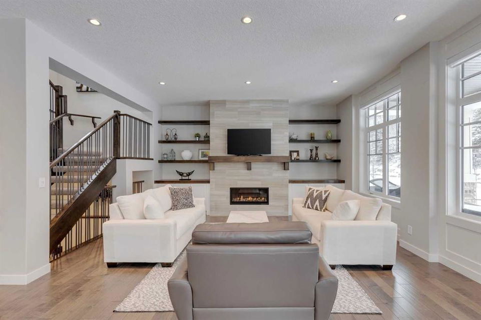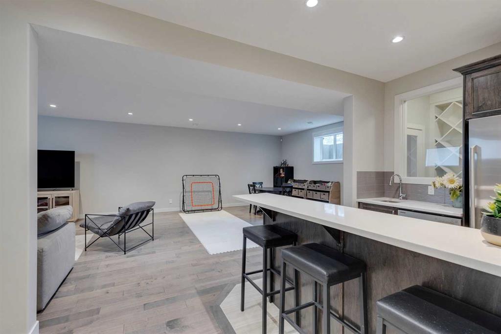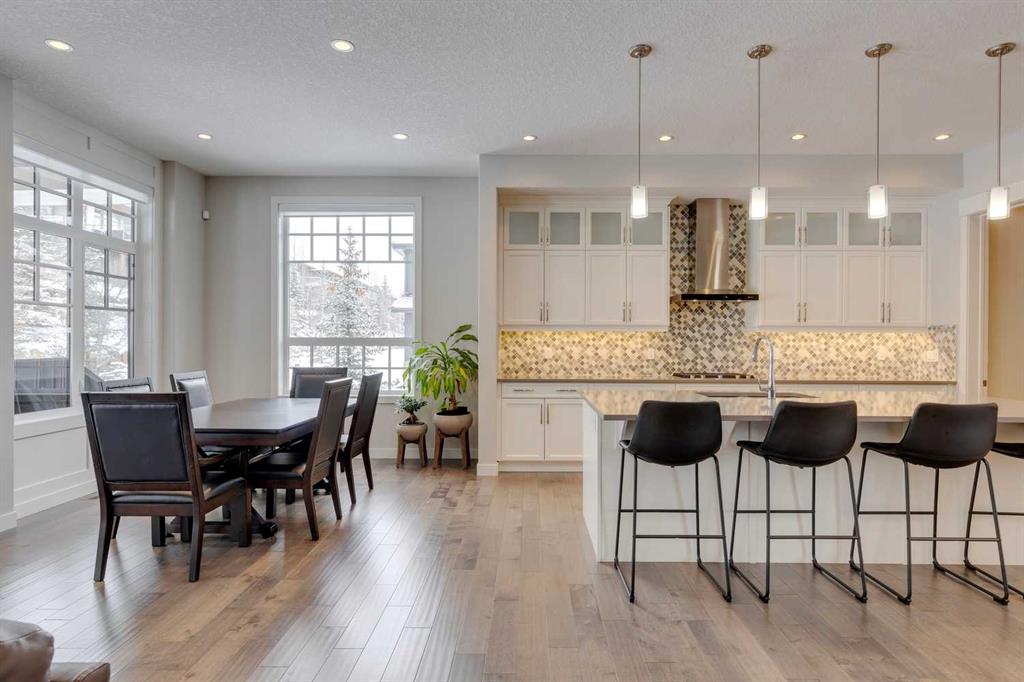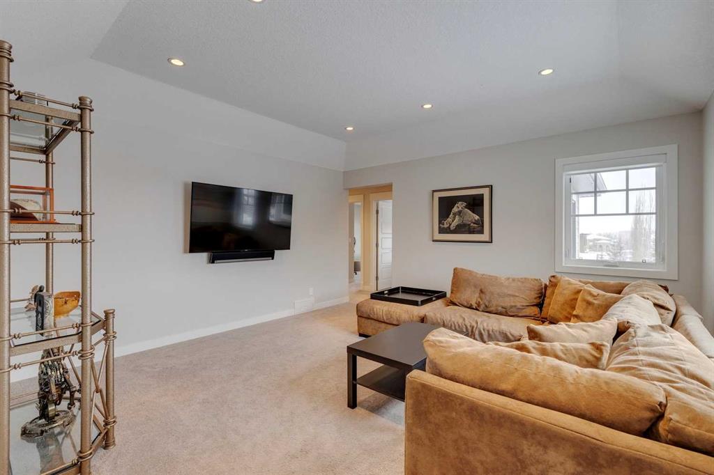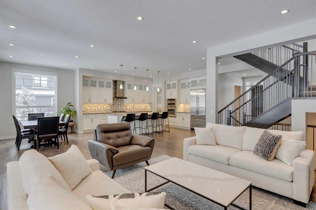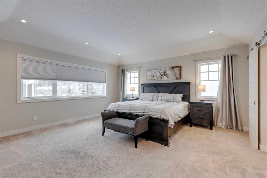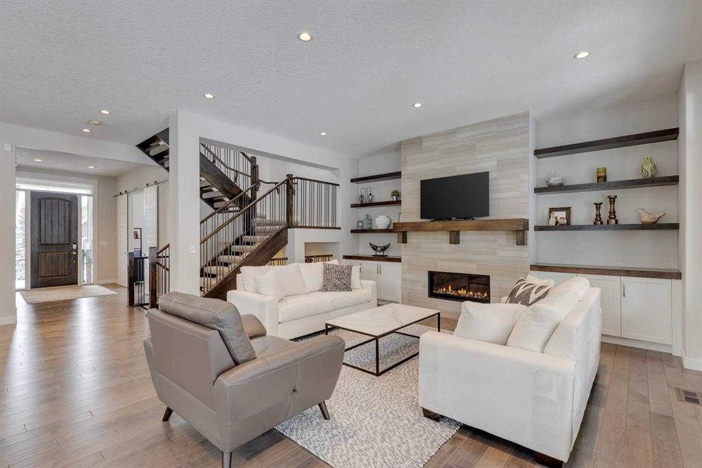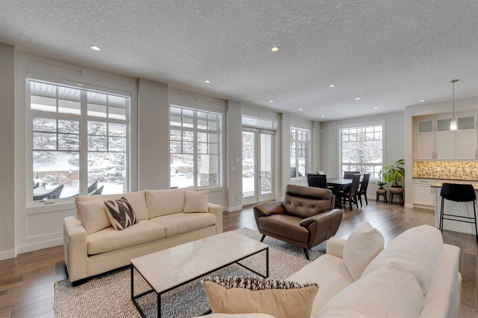 Watermark at Bearspaw – 138 Hillside Terrace: Welcome to this well-maintained home in desirable Watermark at Bearspaw. Situated on a quiet street featuring over 4,500 sq ft of development, 4 + 1 bedrooms, 4.5 bathrooms, a fully developed lower level, and an attached triple car garage. The open and bright main floor has a gorgeous kitchen and breakfast nook, great room, and office/flex room. The kitchen has quartz countertops, a central island with seating for 4, stainless steel appliances, including a gas cooktop, chimney hood fan, and dishwasher, plus built-in appliances that include; a refrigerator, microwave oven, and wall oven. The open concept floor plan features a breakfast nook that provides plenty of space for a large table; a great room with built-in shelves and a gas fireplace with a mantle; a flex room with barn doors which is currently being used as an office/computer room; a 2 pc powder room, a large walk-in pantry and a mud room with L-shaped bench, hooks and ample storage space. The upper level features a bright primary bedroom with a 5 pc ensuite including dual sinks, a tiled glass shower with bench and a soaker tub; a walk-in closet with built-in shelves, rods, and drawers and a sliding door to the laundry room with upper and lower cabinets, sink and hanging rod. You will also find 3 additional bedrooms – two with walk-in closets and one with a 4 pc ensuite bathroom; a central bonus room and a 5 pc main bathroom. The fully developed lower level includes a large rec room with a games area; a tiled wet bar and wine room including a dishwasher and refrigerator and seating for 4; a fifth bedroom and 4 pc bathroom. Additional features of this home include central A/C on the upper level, a backyard concrete patio with a gazebo and hot tub, an exposed aggregate driveway, and underground sprinklers all situated on a lovely landscaped 86 x 149-foot lot. Watermark at Bearspaw is a luxury estate community complete with Central Plaza which has a large pavilion, fire fit, BBQs, outdoor kitchen, an NBA-sized basketball court + much more. The community also offers paved trails that navigate through parkland, cascading streams, and ponds. Located minutes away from the Calgary city limits, only a short drive to Crowchild Trail, LRT/transit, parks, schools, recreational facilities, and easy access for a quick getaway to the mountains. This is an excellent opportunity for an extended family/multi-generational home. Pride of ownership is evident. Call for more info!