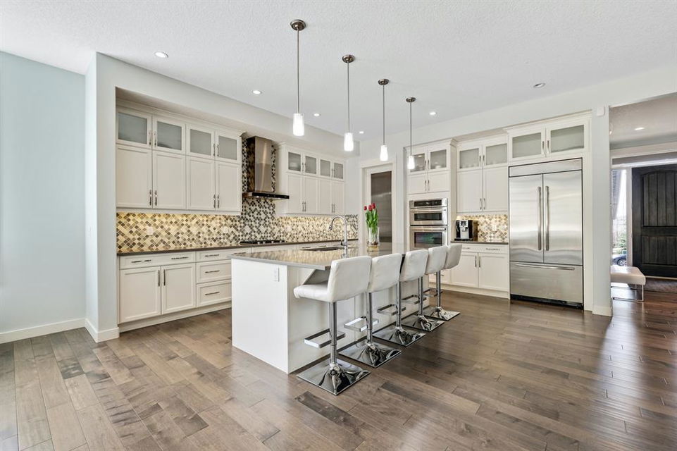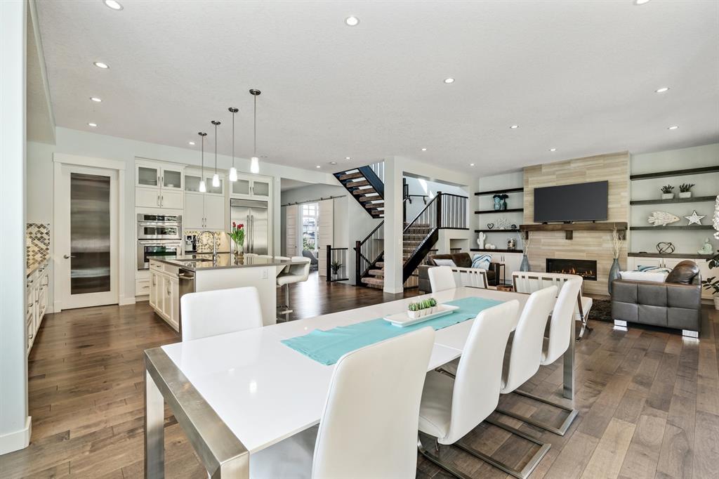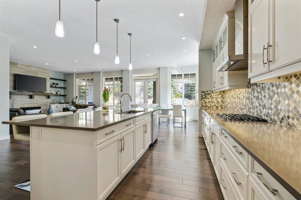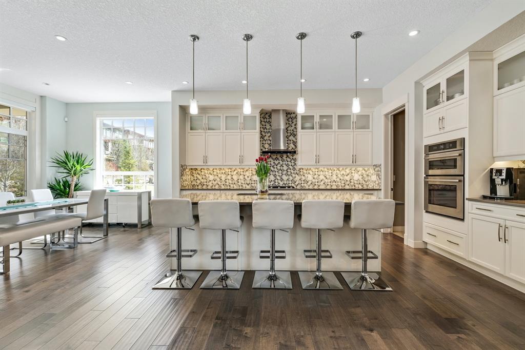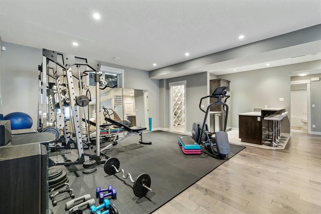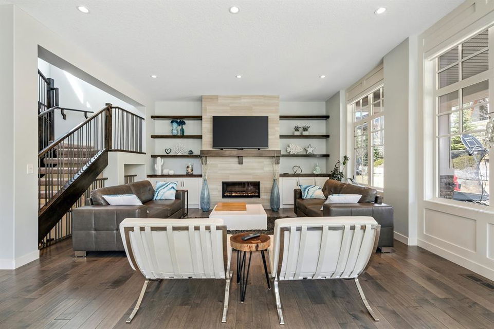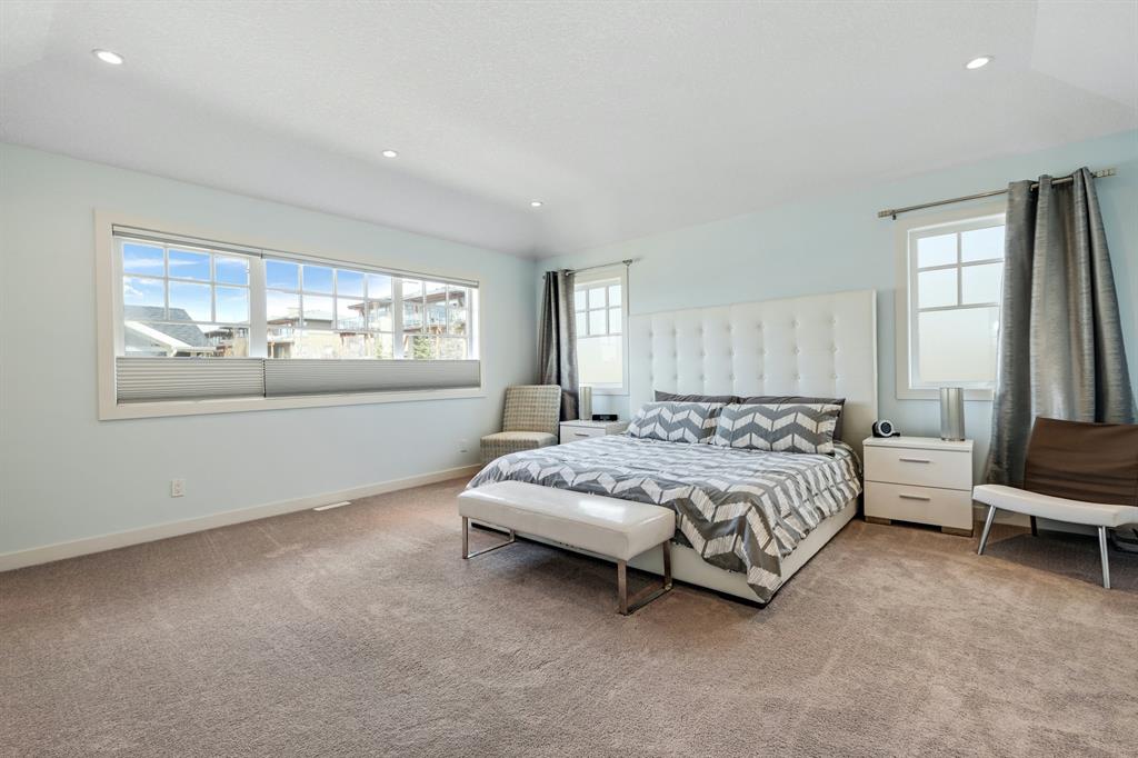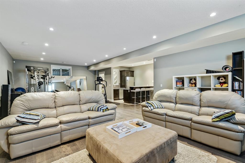 Watermark at Bearspaw is a luxury estate community sought after for its large lot sizes, beautifully built homes and various community amenities. Prominent Homes designed the Campbell III with almost 4,500 square feet of developed living space full of custom features, upgrades and natural light throughout! The open concept main level floorplan boasts a spacious foyer, wide plank hardwood flooring, a front facing home office (flex room), powder room and an ultimate mudroom with custom lockers separating the walk-through pantry and spacious triple car garage. The gourmet kitchen with soft close white cabinetry, quartz counters and premium stainless-steel appliance package opens onto a spacious dining nook and great room with tiled fireplace punctuated with custom built-in cabinetry and shelving. Family and friends will gather around the oversized kitchen island and the massive dining area will help make family dinners a breeze. The massive pantry and impressive cabinet storage space will help you with all other kitchen storage needs. French doors lead to your covered patio and stunning, upscale landscaped yard. Step down to a sunny side deck. An open staircase leads you to the second level featuring 4 generously sized bedrooms, 3 bathrooms, a bonus room with tray ceiling and Laundry! The owners retreat features dual sliding doors leading to a 5pc spa-inspired ensuite complete with glass shower, dual sinks, a deep jetted soaker tub and large walk-in closet. Your convenient upper-level laundry has cabinets and a sink to help with all laundry needs. The professionally developed basement with oversized windows features a large recreation room, family room, kitchenette, wine room, 5th bedroom and 4pc bathroom. Awesome curb appeal, pristine lot, exterior stonework and accents, exposed aggregate driveway and underground sprinklers! Outside your door there are 5km of paved trails, linking cascading ponds and a NBA-sized sports court. 20 minutes to city centre, quick access to golf, recreation facilities, shopping, and skiing and snowboarding is just an hour away!