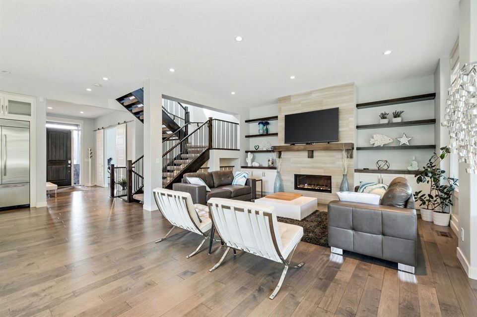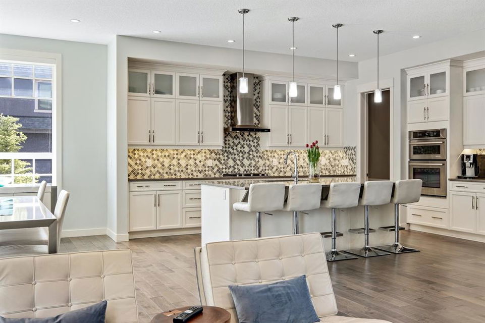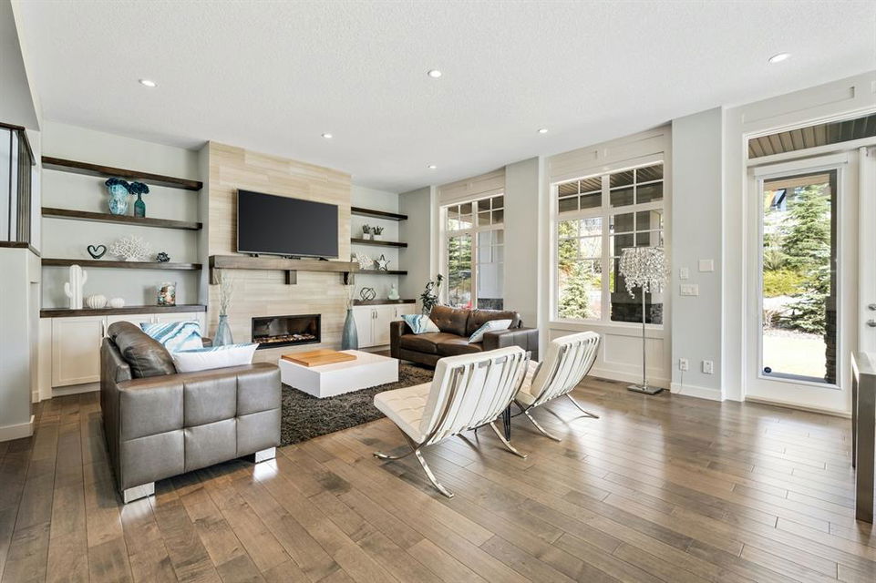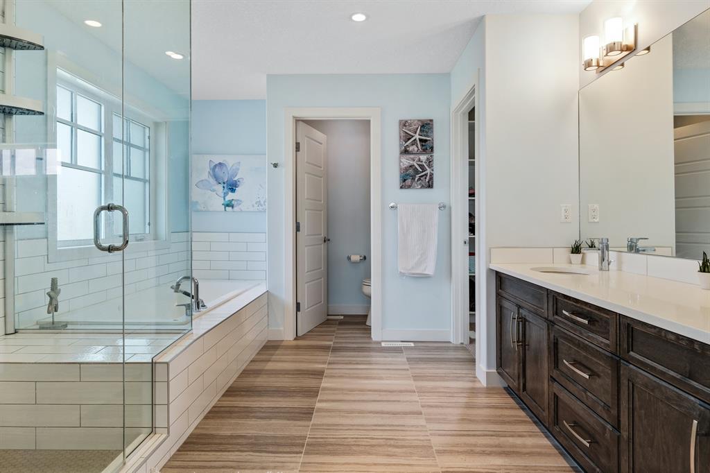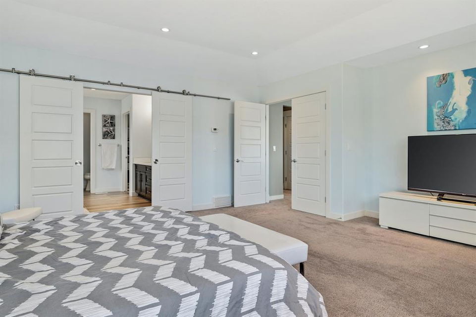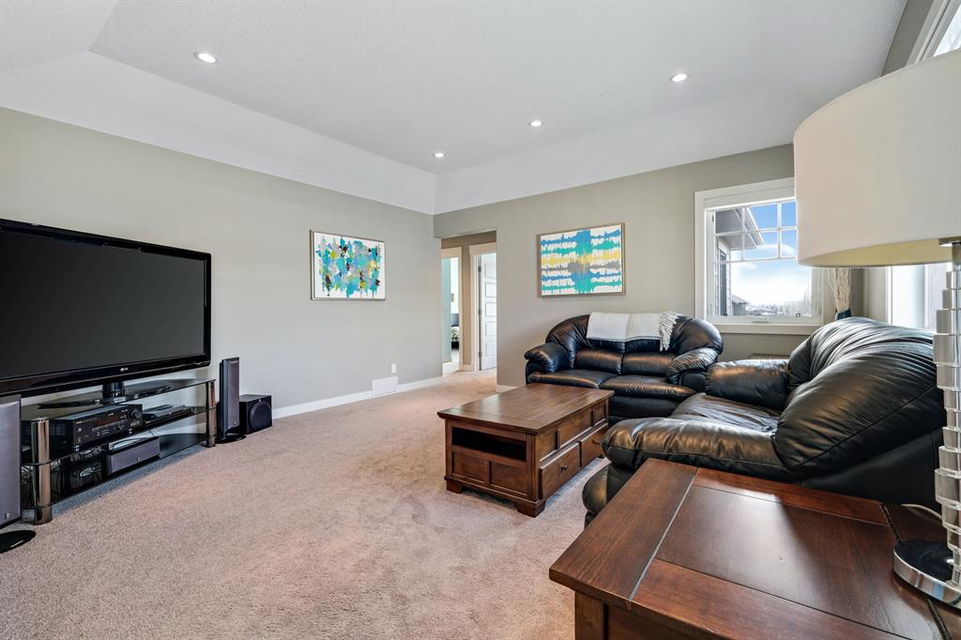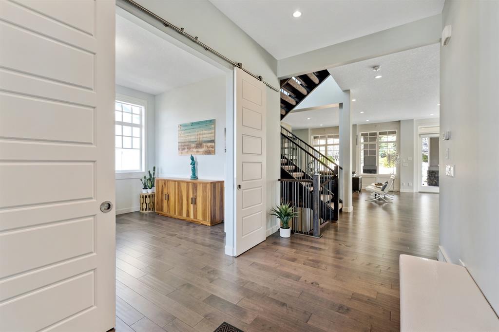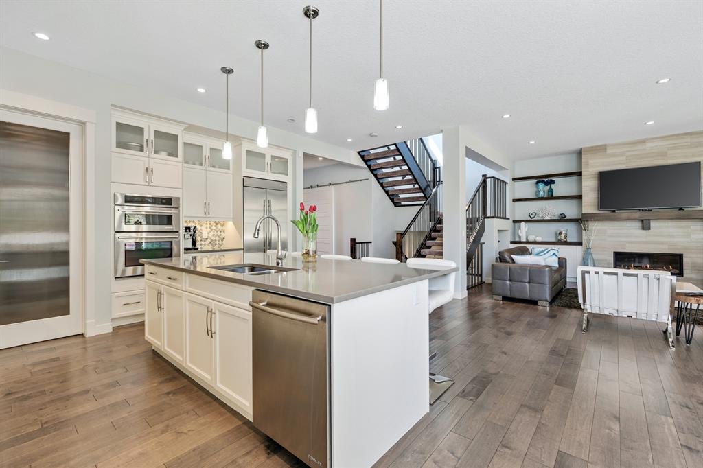 Watermark at Bearspaw is a luxury estate community sought after for its large lot sizes, beautifully built homes and various community amenities. Prominent Homes designed the Campbell III with almost 4,500 square feet of developed living space full of custom features, upgrades and natural light throughout! The open concept main level floorplan boasts a spacious foyer, wide plank hardwood flooring, a front facing home office (flex room), powder room and an ultimate mudroom with custom lockers separating the walk-through pantry and spacious triple car garage. The gourmet kitchen with soft close white cabinetry, quartz counters and premium stainless-steel appliance package opens onto a spacious dining nook and great room with tiled fireplace punctuated with custom built-in cabinetry and shelving. Family and friends will gather around the oversized kitchen island and the massive dining area will help make family dinners a breeze. The massive pantry and impressive cabinet storage space will help you with all other kitchen storage needs. French doors lead to your covered patio and stunning, upscale landscaped yard. Step down to a sunny side deck. An open staircase leads you to the second level featuring 4 generously sized bedrooms, 3 bathrooms, a bonus room with tray ceiling and Laundry! The owners retreat features dual sliding doors leading to a 5pc spa-inspired ensuite complete with glass shower, dual sinks, a deep jetted soaker tub and large walk-in closet. Your convenient upper-level laundry has cabinets and a sink to help with all laundry needs. The professionally developed basement with oversized windows features a large recreation room, family room, kitchenette, wine room, 5th bedroom and 4pc bathroom. Awesome curb appeal, pristine lot, exterior stonework and accents, exposed aggregate driveway and underground sprinklers! Outside your door there are 5km of paved trails, linking cascading ponds and a NBA-sized sports court. 20 minutes to city centre, quick access to golf, recreation facilities, shopping, and skiing and snowboarding is just an hour away!