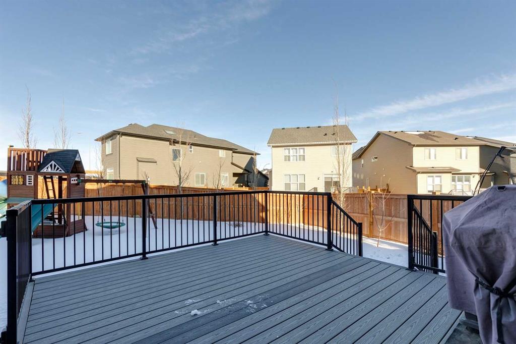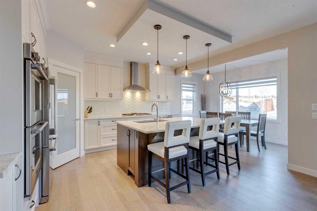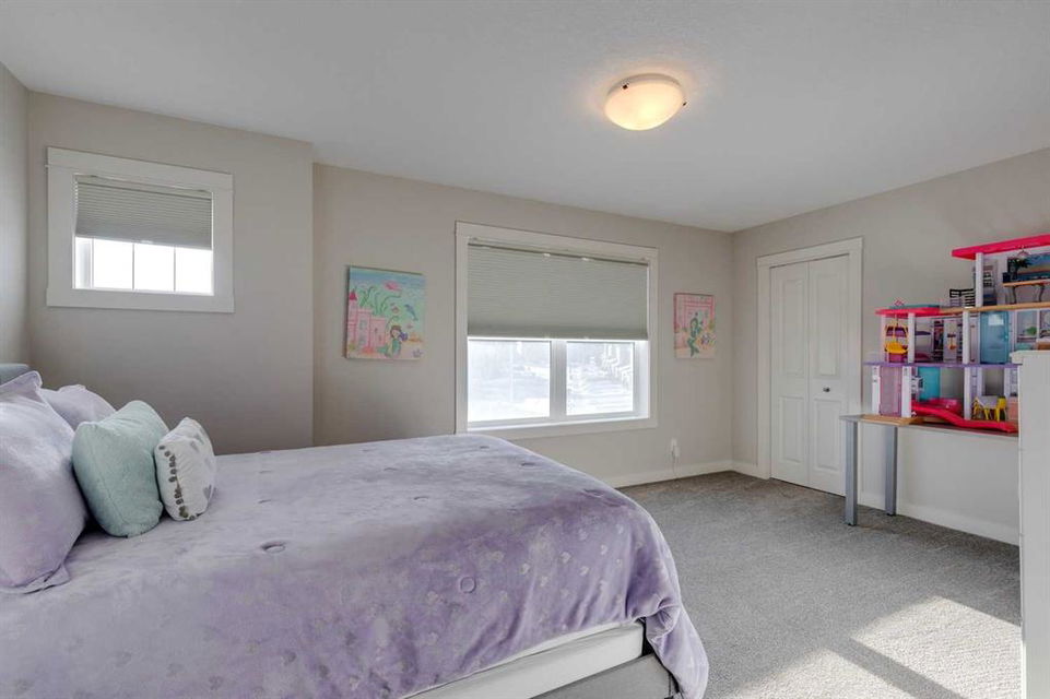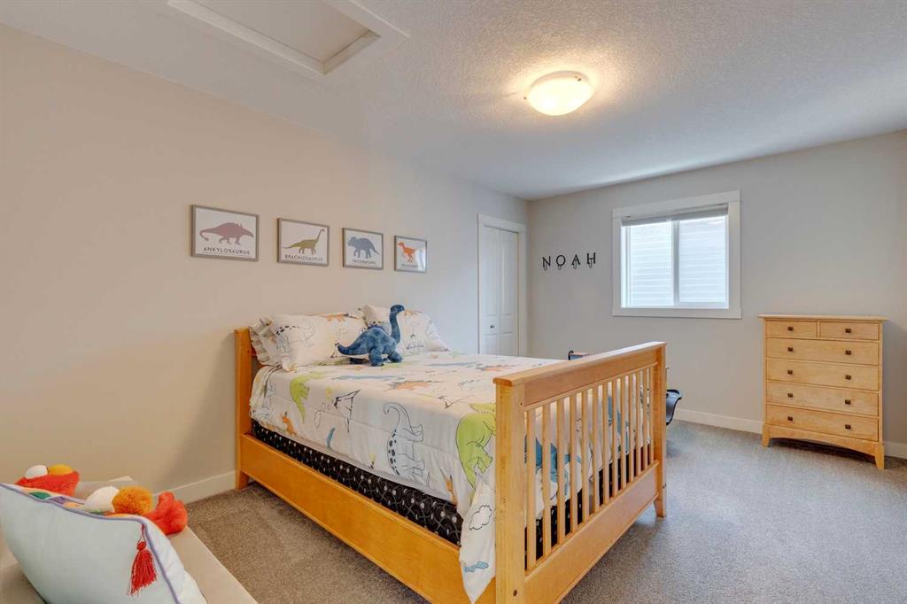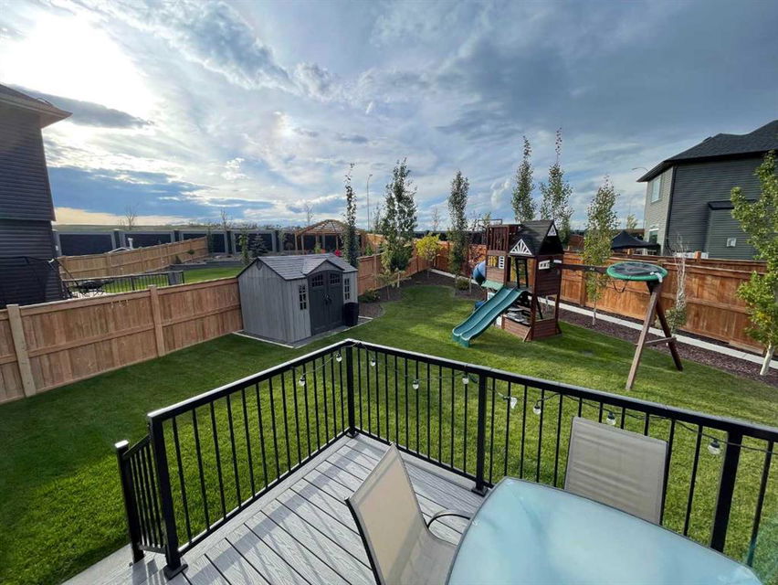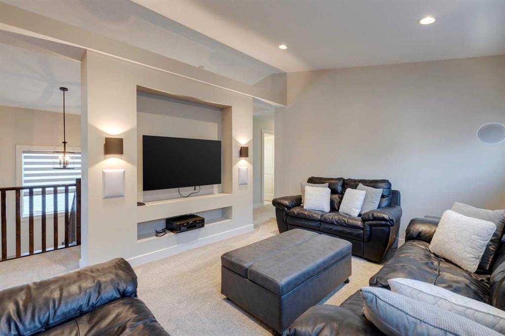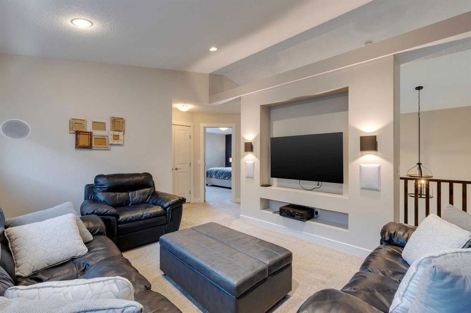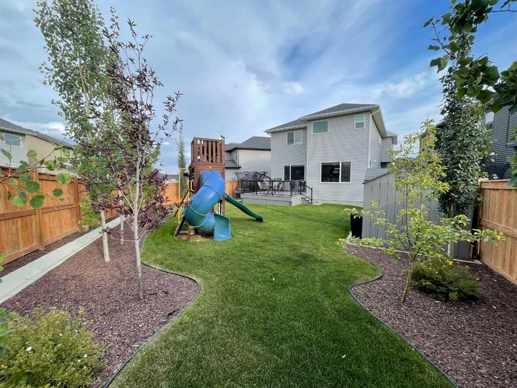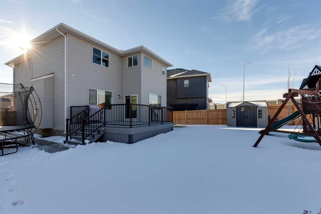 Nolan Hill – 153 Nolanhurst Place NW: Welcome to this immaculately maintained 3 + 2 bedroom, 3.5 bathroom estate home situated on a large 6,318 sq ft pie-shaped lot with central A/C and Gemstone Lights. This home, built by Shane Homes, is located on a quiet cul-de-sac featuring over 3,500 sq ft of total development including an oversized heated double-car garage with a spacious storage loft and room to park a truck. The bright and open main floor features hardwood floors a spacious open-to-above foyer; a kitchen with stainless steel appliances including a gas cooktop, dishwasher, built-in microwave, chimney hood fan, and dual wall ovens, corner pantry, and island with seating for 3; a breakfast nook with access to the backyard; a living room with gas mantle fireplace; a den with dual pocket doors and a 2 pc powder room. The upper level features a large primary bedroom with a walk-in closet, a 5 pc ensuite with granite countertops, dual sinks, soaker tub, and separate shower; 2 additional large bedrooms with walk-in closets; a built-in desk area, a central bonus room with built-in speakers; a laundry room with counter top and 4 pc main bathroom. The builder-developed lower level features a large family room/rec room with built-in speakers, projector and screen, a wet bar with a beverage fridge; 2 additional bedrooms, a 4 pc bathroom, and a dedicated storage room. This home shows 10/10 & pride of ownership is evident. This home is situated on a large, beautifully landscaped pie lot with a composite deck with a gas line, and exposed aggregate walkways including a storage shed and play structure. Located in Nolan Hill close to green spaces, playgrounds, shops, eateries, and close to many major roads. A must-see! You won’t be disappointed. Call for more info!