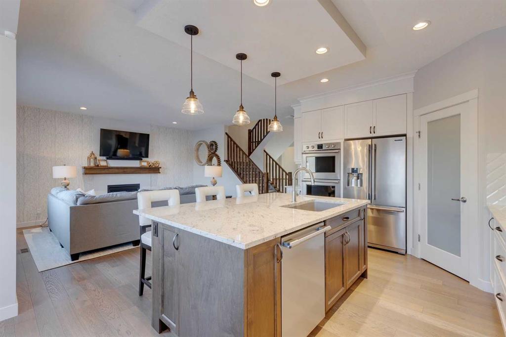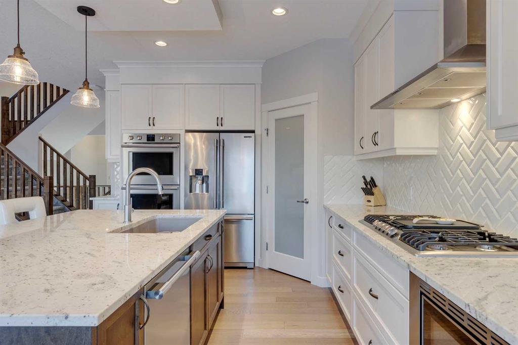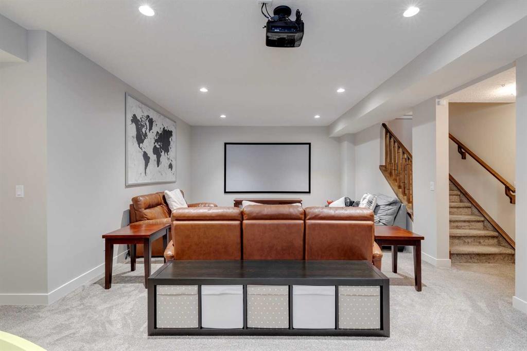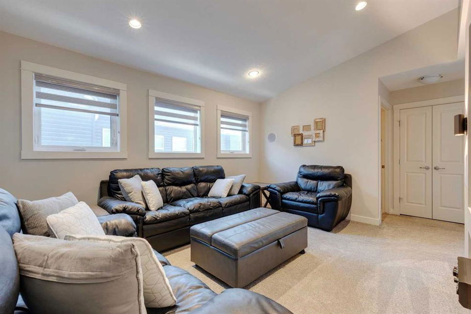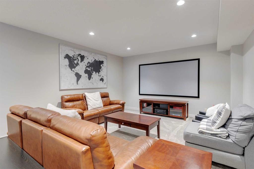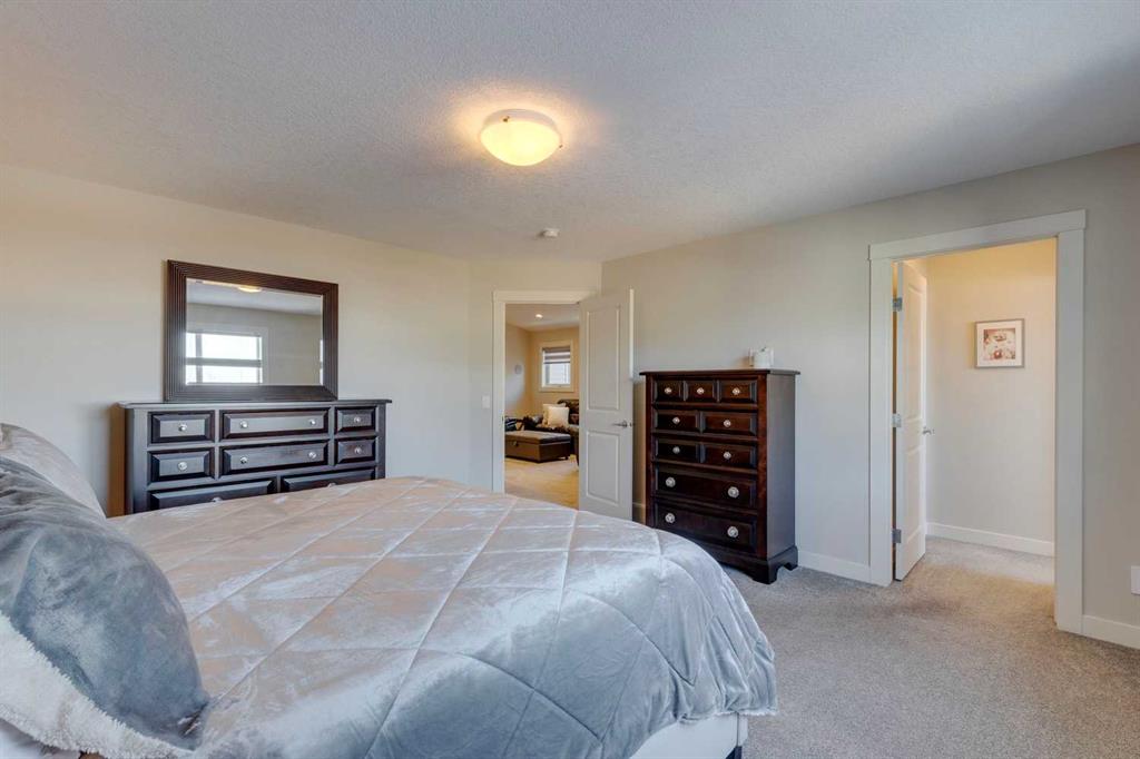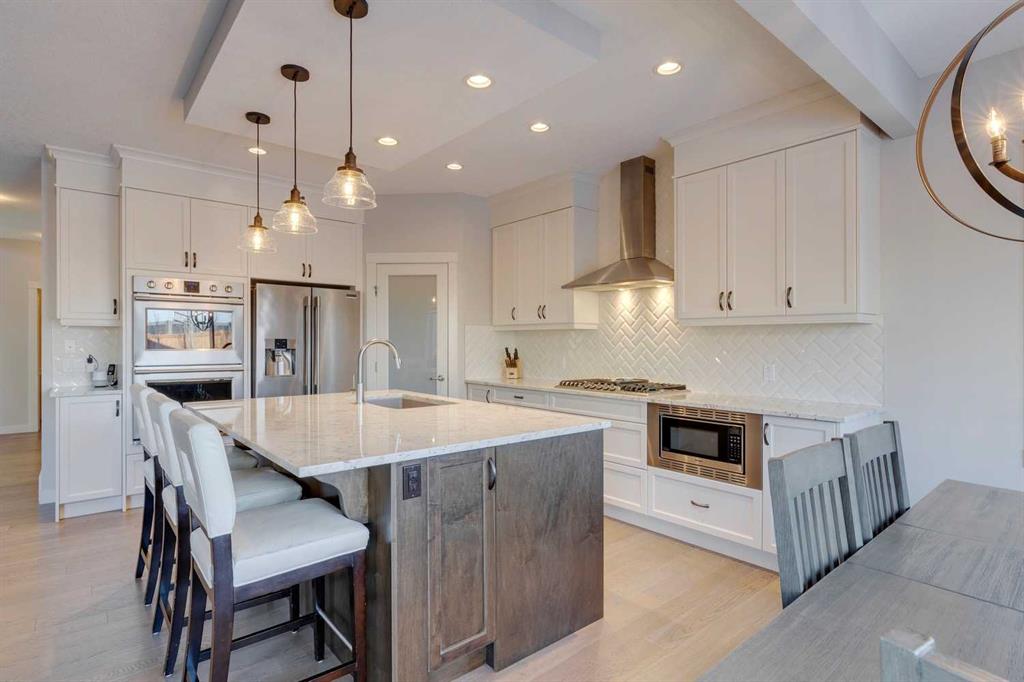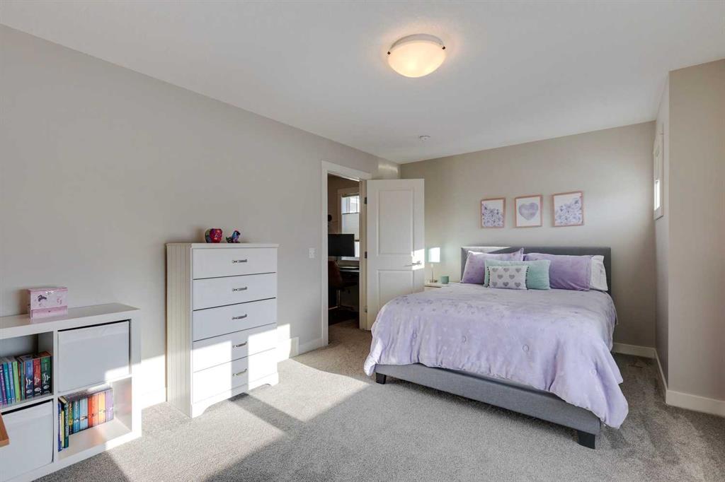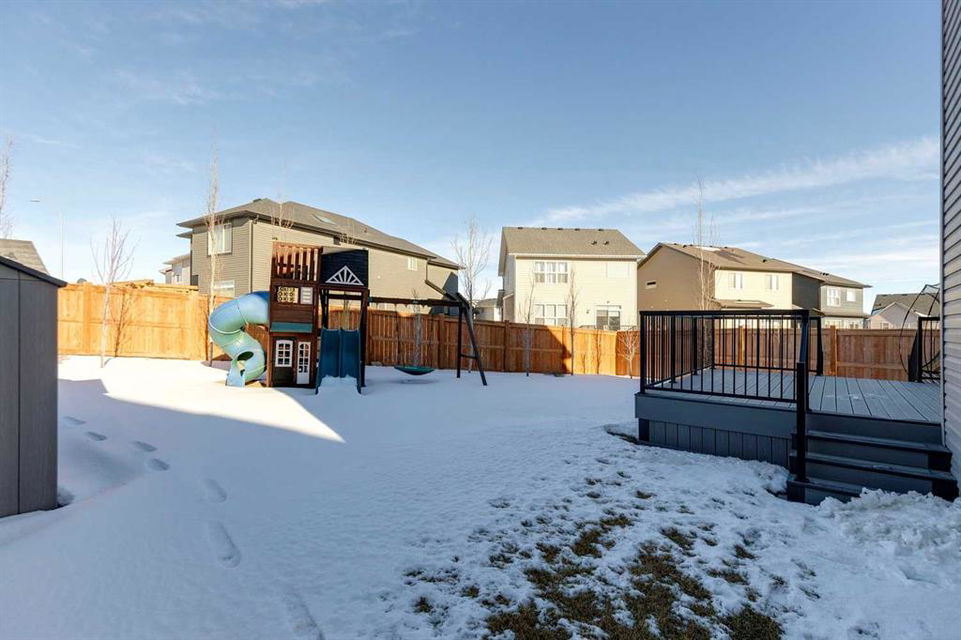 Nolan Hill – 153 Nolanhurst Place NW: Welcome to this immaculately maintained 3 + 2 bedroom, 3.5 bathroom estate home situated on a large 6,318 sq ft pie-shaped lot with central A/C and Gemstone Lights. This home, built by Shane Homes, is located on a quiet cul-de-sac featuring over 3,500 sq ft of total development including an oversized heated double-car garage with a spacious storage loft and room to park a truck. The bright and open main floor features hardwood floors a spacious open-to-above foyer; a kitchen with stainless steel appliances including a gas cooktop, dishwasher, built-in microwave, chimney hood fan, and dual wall ovens, corner pantry, and island with seating for 3; a breakfast nook with access to the backyard; a living room with gas mantle fireplace; a den with dual pocket doors and a 2 pc powder room. The upper level features a large primary bedroom with a walk-in closet, a 5 pc ensuite with granite countertops, dual sinks, soaker tub, and separate shower; 2 additional large bedrooms with walk-in closets; a built-in desk area, a central bonus room with built-in speakers; a laundry room with counter top and 4 pc main bathroom. The builder-developed lower level features a large family room/rec room with built-in speakers, projector and screen, a wet bar with a beverage fridge; 2 additional bedrooms, a 4 pc bathroom, and a dedicated storage room. This home shows 10/10 & pride of ownership is evident. This home is situated on a large, beautifully landscaped pie lot with a composite deck with a gas line, and exposed aggregate walkways including a storage shed and play structure. Located in Nolan Hill close to green spaces, playgrounds, shops, eateries, and close to many major roads. A must-see! You won’t be disappointed. Call for more info!