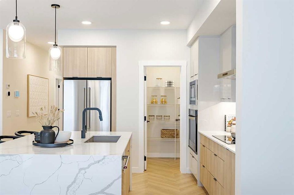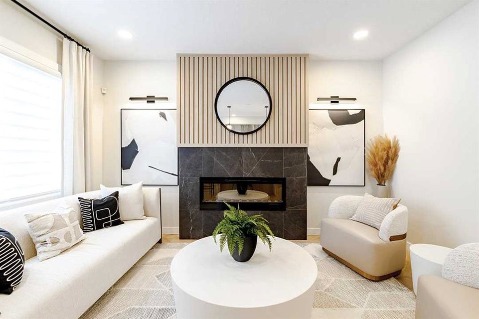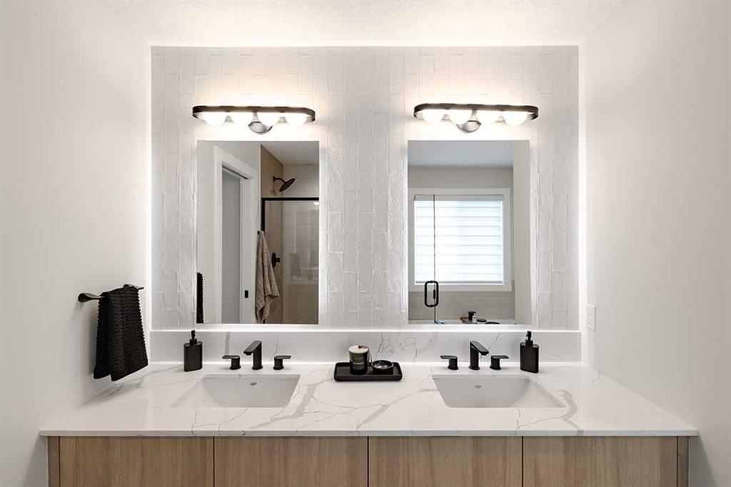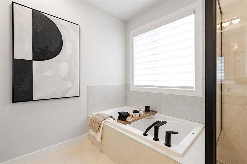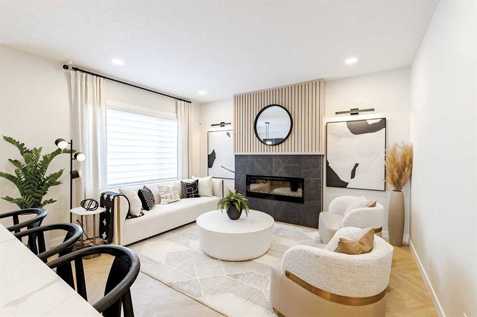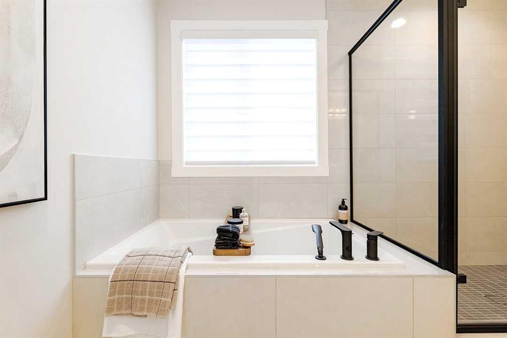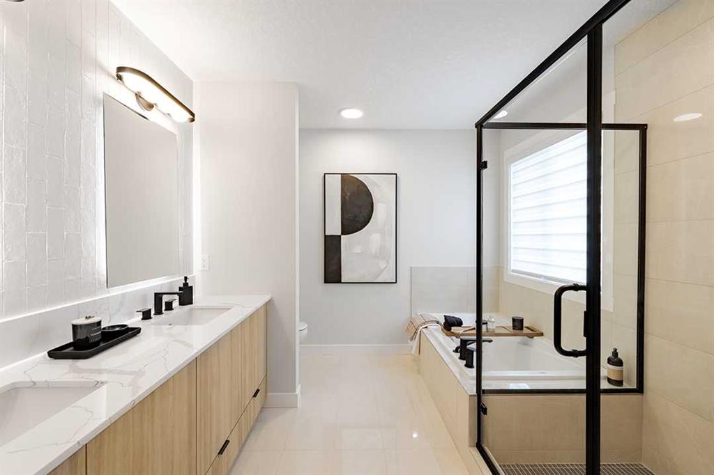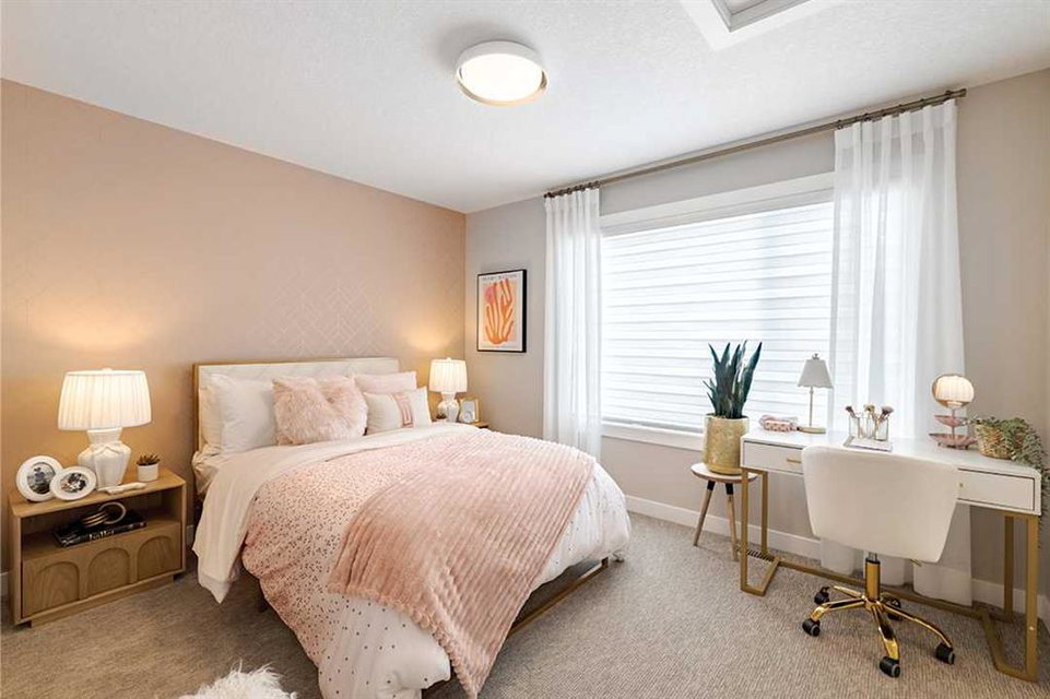 Welcome to the Katalina by Shane Homes, a pre construction home with a tentative 10-12 month possession timeframe. This front-drive home with a double attached garage is located in the community of Rose Ranch. The main floor features a full bedroom and full bathroom with shower, ideal for guests. The open-concept layout includes a living room with electric fireplace, dining nook, and a kitchen with island seating and a walk-in pantry. Upstairs offers three bedrooms, including the primary bedroom with dual vanity ensuite, soaker tub, separate shower, and walk-in closet. All upstairs bedrooms include walk-in closets, along with a full laundry room and an additional full bathroom. The undeveloped basement is ready for potential future development and includes rough-ins. This home can be customized to suit buyer needs. Photos are illustrative and for representative purposes only.