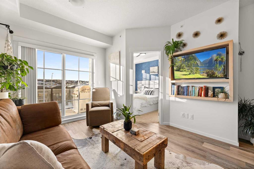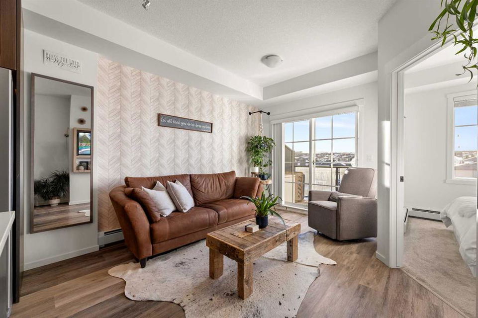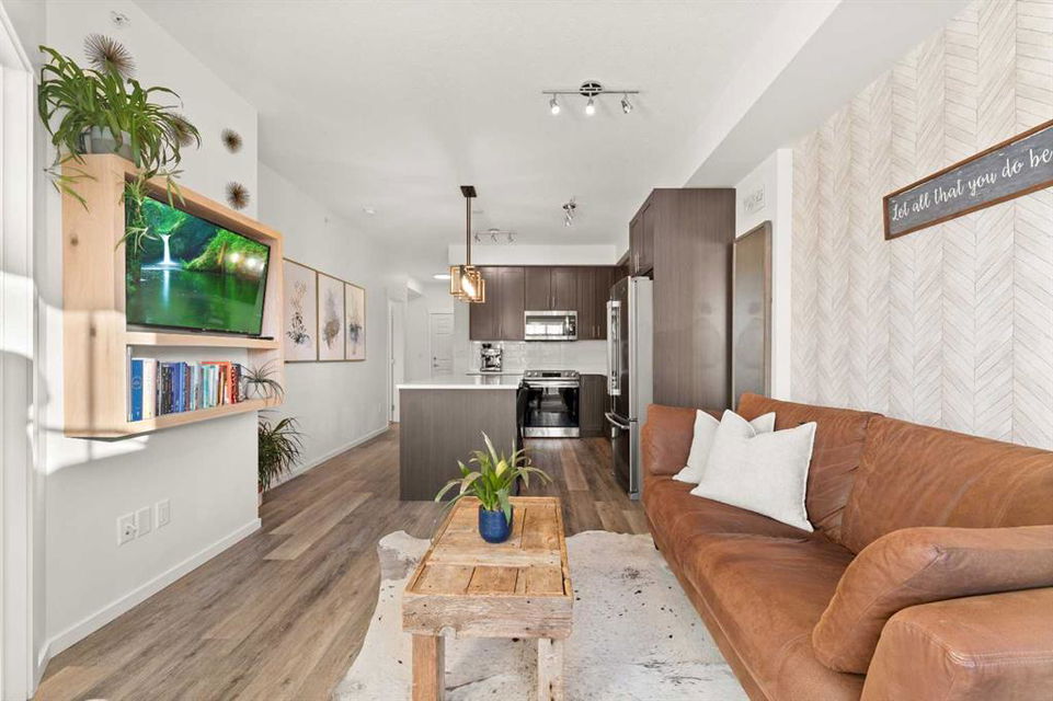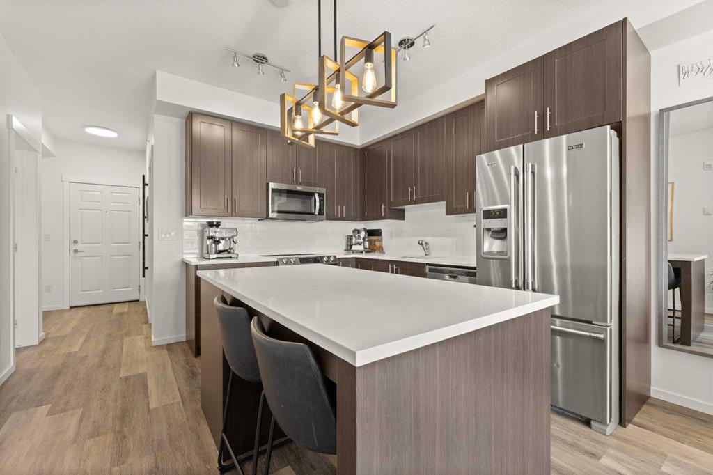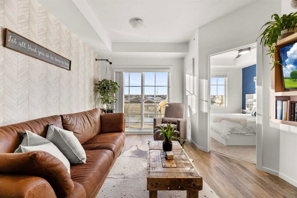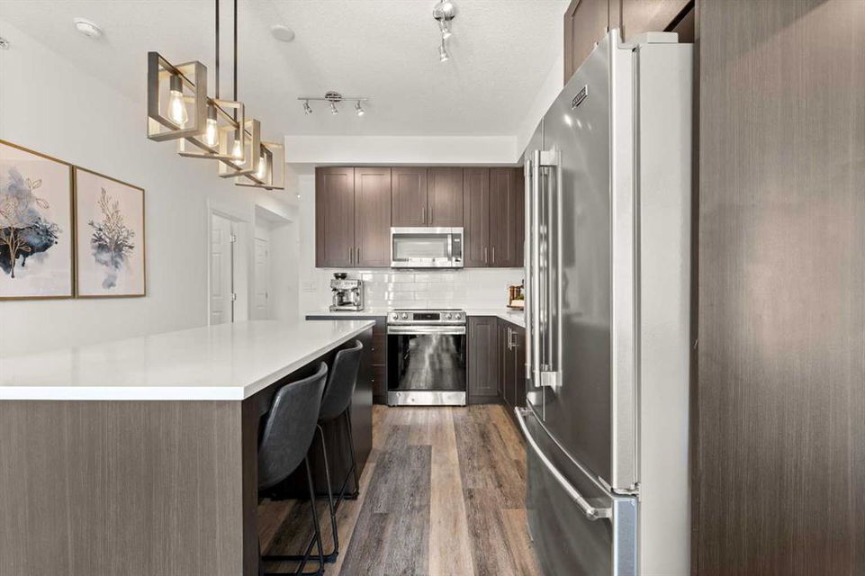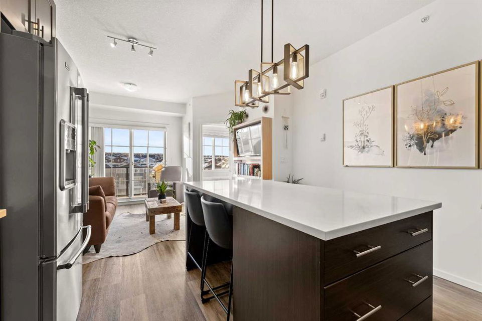 Nestled within picturesque Sage Meadows, this sleek top FLOOR TWO-bedroom, TWO full bathroom condominium with concrete floor sound barriers has been beautifully maintained and is tailored perfectly for young professionals or those seeking a downsized lifestyle. As you enter, you are greeted with stunning modern finishes, vinyl plank flooring and 9′ ceilings. The kitchen is a chefs delight with subway tiled backsplash, upgraded faucet, full height kitchen cabinets, quartz countertops and upgraded stainless steel appliances. The kitchen seamlessly unfolds into the spacious dining and living room. Just off the living room, you can step outside on your balcony with a gas line for BBQ and enjoy those warm summer evenings. Both bedrooms are generously sized, with the primary bedroom offering a custom designed built in walk-thru closet and 4 piece ensuite. An additional four piece bathroom, in unit laundry, a storage locker, and a titled energized parking stall near the building entrance make this home complete. Conveniently located mere minutes from Creekside Shopping Center and Sage Hill Plaza, this home ensures easy access to urban amenities. Embrace a lifestyle where the beauty of nature meets the convenience of city living, all within easy reach of major routes like Deerfoot and Stoney Trail.