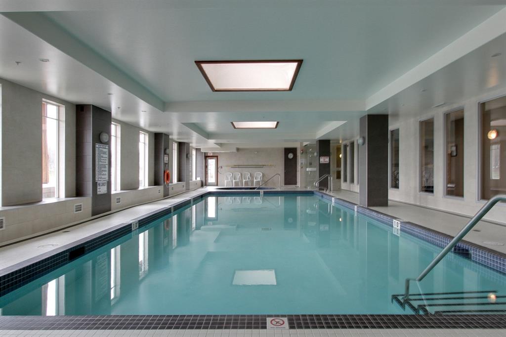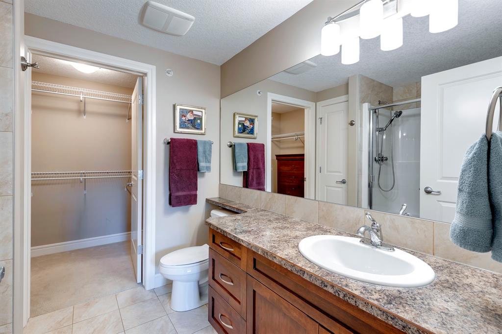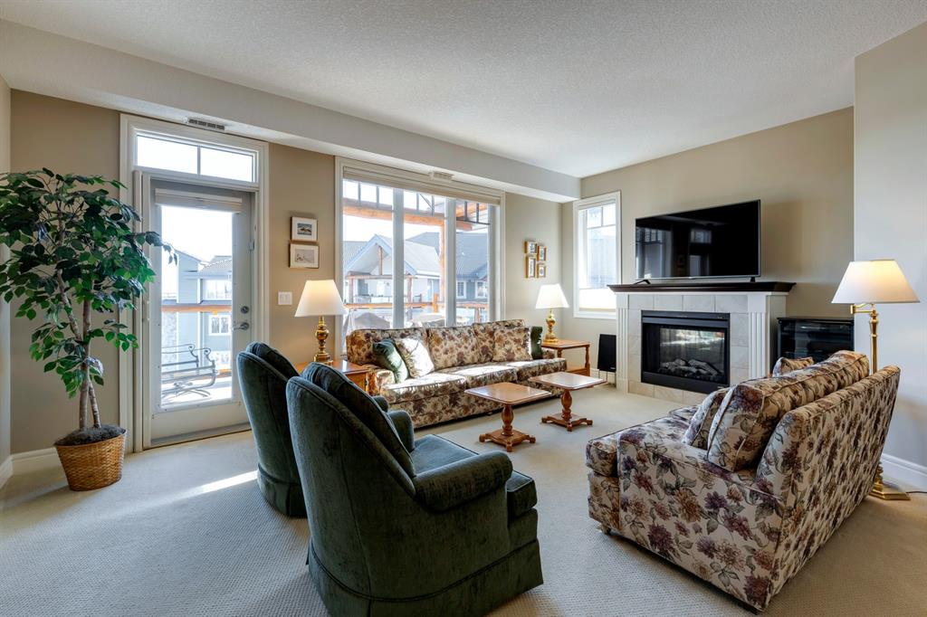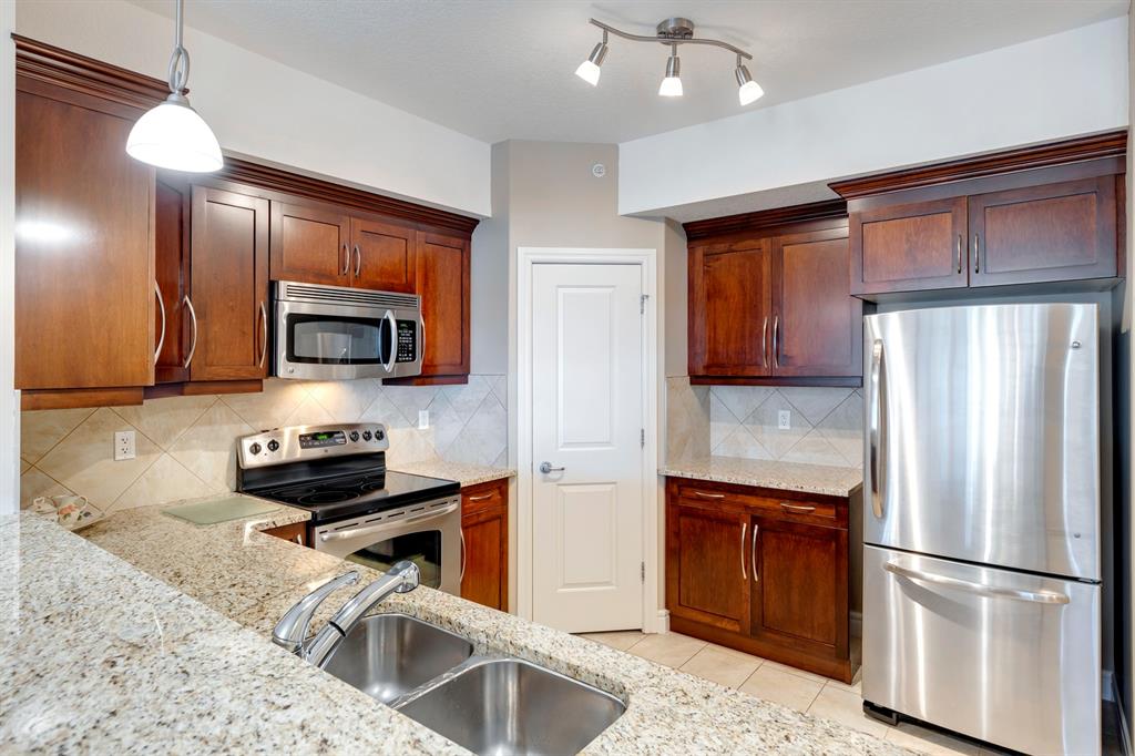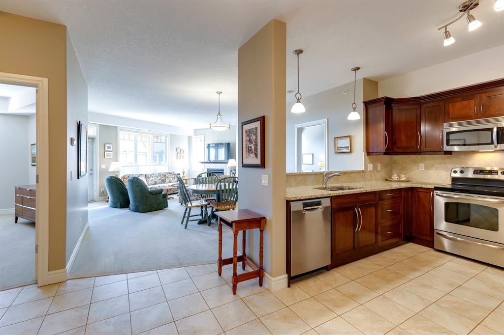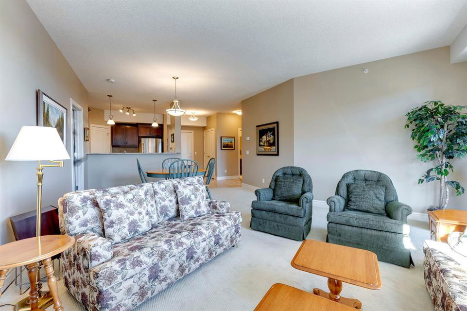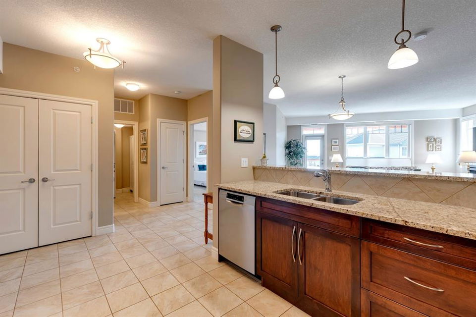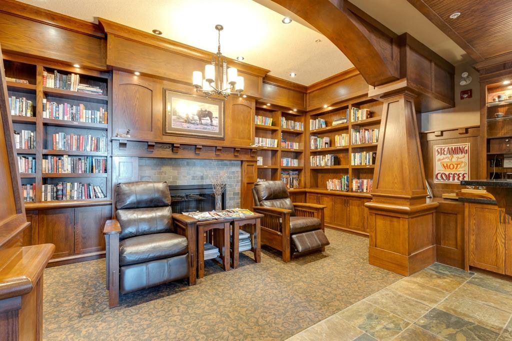 Sanderson Ridge – Evergreen – #2428, 2330 Fish Creek Boulevard SW: Fish Creek Park could be your backyard in this top floor 1,187 sq ft 2 bedroom + 2 bathroom unit in sought-after Sanderson Ridge. This unit includes central A/C, one titled underground parking stall, and an assigned storage locker. The open floor plan features a kitchen has stainless steel appliances, granite countertops, a corner pantry, and a breakfast bar with seating for 3; the dining area opens to the living room with a gas fireplace and access to the large covered balcony with BBQ gas hook up; the large primary bedroom has built-in California Closet shelves and a walk-in closet and a spacious 3 pc ensuite with glass shower; the additional bedroom has custom closet with California Closet organizers; 4 pc main bathroom, laundry room with stacked washer/dryer and space for freezer and additional storage. Enjoy the views of beautiful Fish Creek Park from your private balcony. Sanderson Ridge is a 40+ building with endless amenities including a guest suite, indoor swimming pool, sauna, hot tub, movie theatre, bar, ping pong table, shuffleboard, darts, a 5-pin bowling alley, wine-making room, craft and sewing area, woodworking shop, barber shop, fitness center, library, billiards, poker room, hair salon, ample visitor parking & much more! Condo fees include heat, electricity, and water. Located in Evergreen conveniently located close to walking paths, minutes away from Stoney Trail, Macleod Trail, and Shawnessy Shopping Centre. The building and the unit are well-maintained. Easy to show with quick possession available. Call for more info!