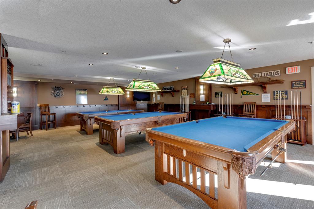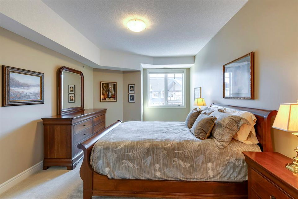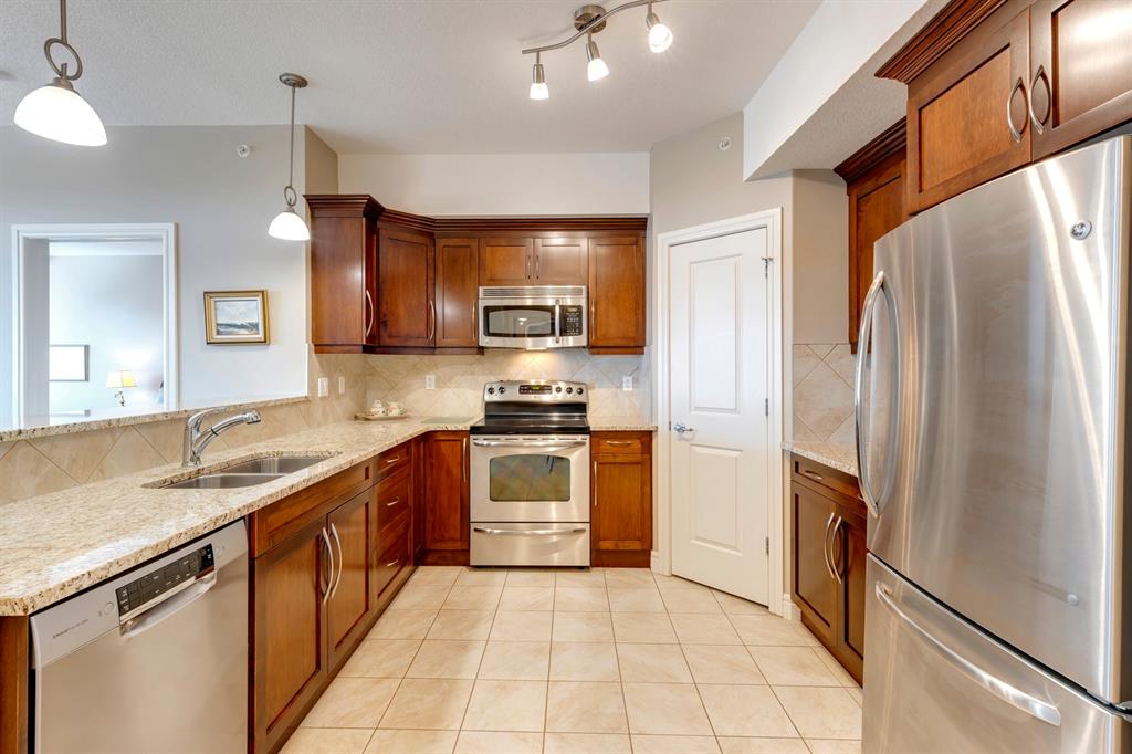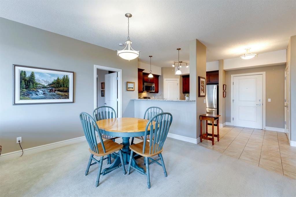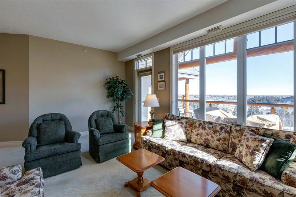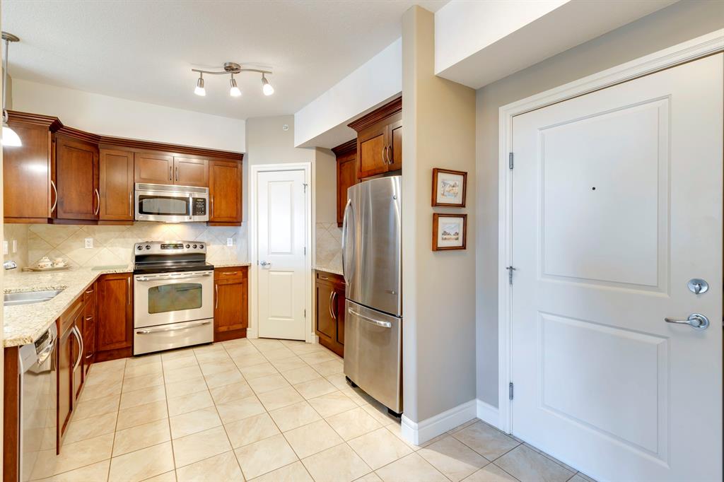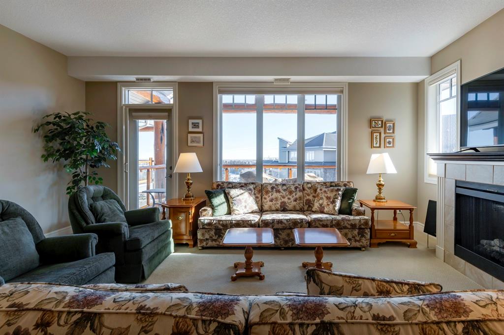 Sanderson Ridge – Evergreen – #2428, 2330 Fish Creek Boulevard SW: Fish Creek Park could be your backyard in this top floor 1,187 sq ft 2 bedroom + 2 bathroom unit in sought-after Sanderson Ridge. This unit includes central A/C, one titled underground parking stall, and an assigned storage locker. The open floor plan features a kitchen has stainless steel appliances, granite countertops, a corner pantry, and a breakfast bar with seating for 3; the dining area opens to the living room with a gas fireplace and access to the large covered balcony with BBQ gas hook up; the large primary bedroom has built-in California Closet shelves and a walk-in closet and a spacious 3 pc ensuite with glass shower; the additional bedroom has custom closet with California Closet organizers; 4 pc main bathroom, laundry room with stacked washer/dryer and space for freezer and additional storage. Enjoy the views of beautiful Fish Creek Park from your private balcony. Sanderson Ridge is a 40+ building with endless amenities including a guest suite, indoor swimming pool, sauna, hot tub, movie theatre, bar, ping pong table, shuffleboard, darts, a 5-pin bowling alley, wine-making room, craft and sewing area, woodworking shop, barber shop, fitness center, library, billiards, poker room, hair salon, ample visitor parking & much more! Condo fees include heat, electricity, and water. Located in Evergreen conveniently located close to walking paths, minutes away from Stoney Trail, Macleod Trail, and Shawnessy Shopping Centre. The building and the unit are well-maintained. Easy to show with quick possession available. Call for more info!