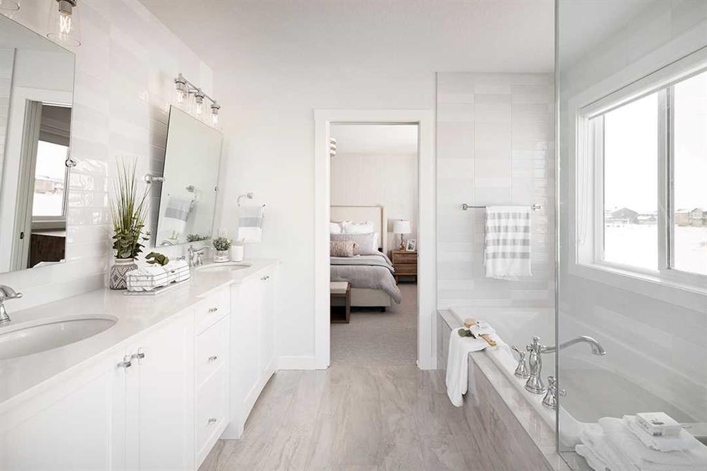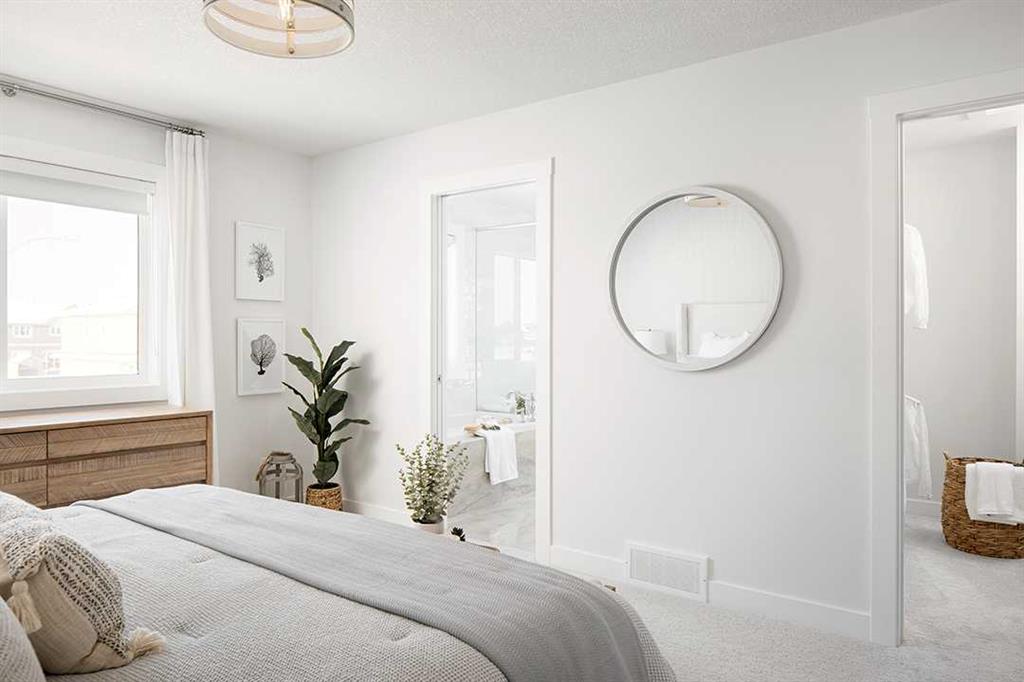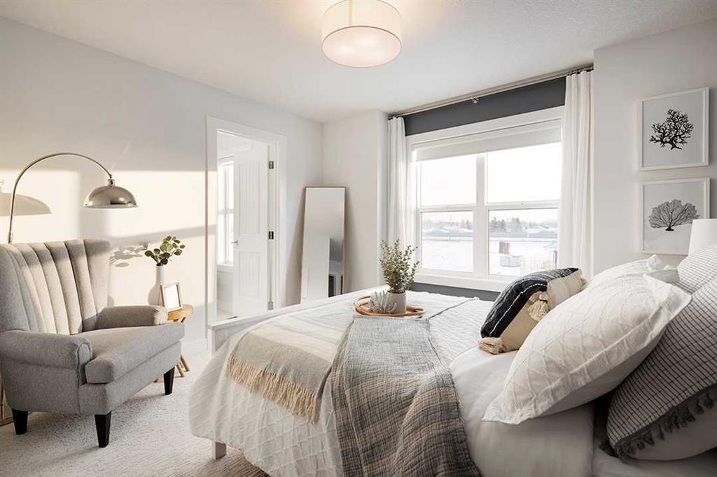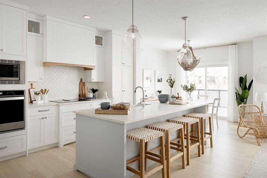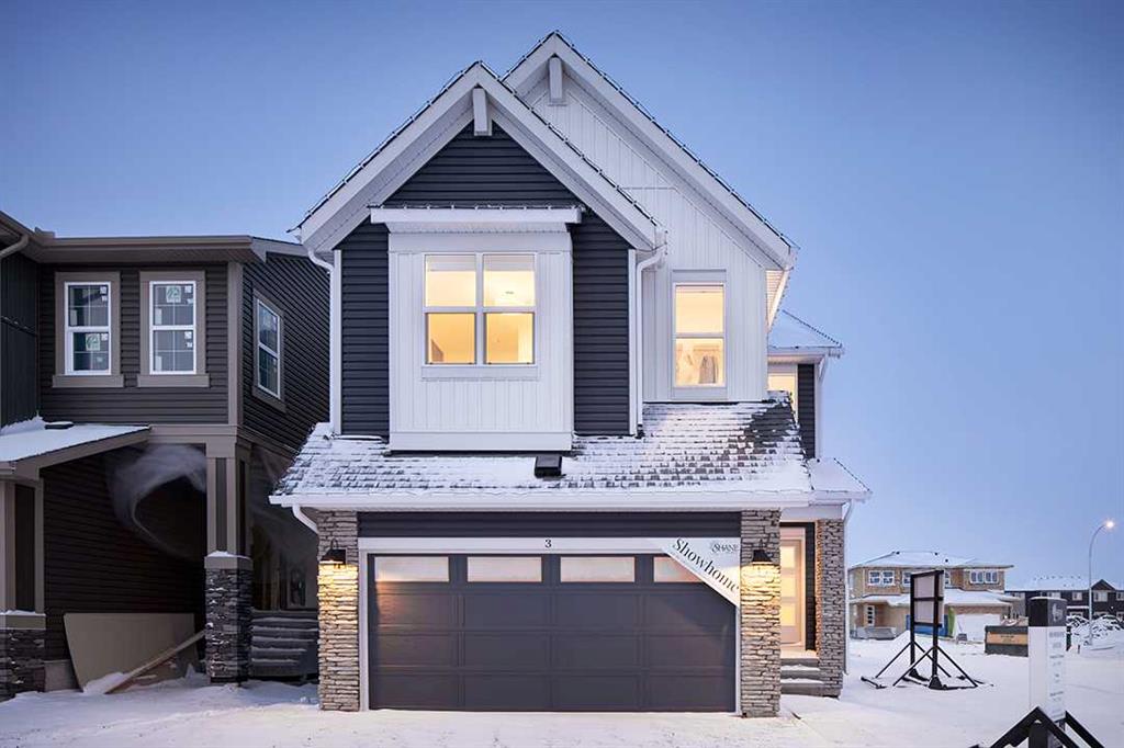 Midtown – 3 Midgrove Drive SW: This is a fantastic opportunity to own the current Shane Homes Showhome in Midtown. This Manhattan III showhome is brand new and never lived in with 2,299 sq ft, plenty of builder upgrades throughout, 4 bedrooms, 2.5 bathrooms and an attached double car garage. The open main floor greets you with a spacious open-to-above foyer, a bright white kitchen with a central island with seating for 4, ample cabinets for storage, stainless steel appliances including a built-in hood with custom cabinetry, walk-through pantry leads to the mud room; breakfast nook with west views; living room with custom mantle and surround feature on the electric fireplace; 2 pc powder room leads to the tiled mudroom with bench and lockers. The upper level features a primary bedroom with walk-in closet, spa-like 5 pc ensuite complete with soaker tub, glass shower with bench, dual sinks, and toilet with separate door; 3 additional bedrooms – 2 bedrooms with walk-in closets; central bonus room; 4 pc main bathroom; laundry room with folding shelf, hanging rod, shelf and additional linen storage. The lower level basement remains unspoiled. This corner lot has a west backyard backing onto a walking path and pond. This showhome located in Midtown of Airdrie is just steps away from the pond and pedestrian bridge, promenade with shops, and nearby schools. Airdrie is less than 20 minutes to the Calgary airport, less than 10 minutes to the QE II, and 15 minutes to north Calgary. Call for more info!