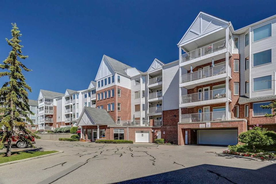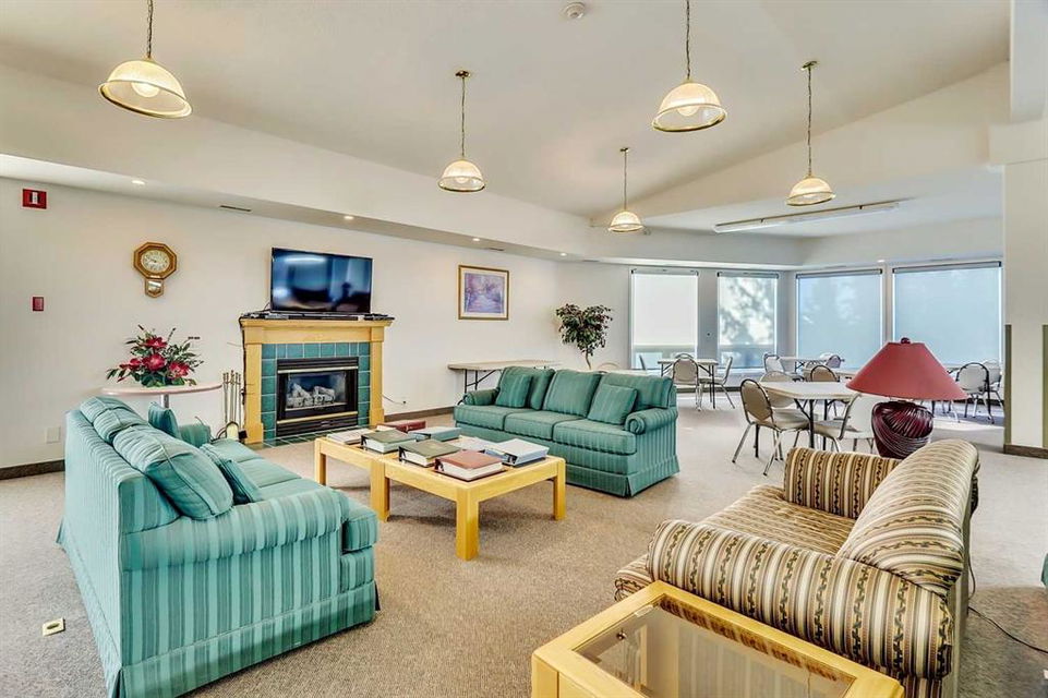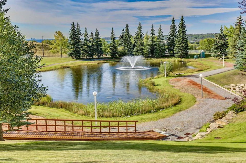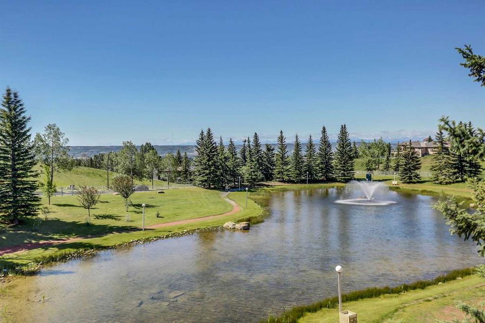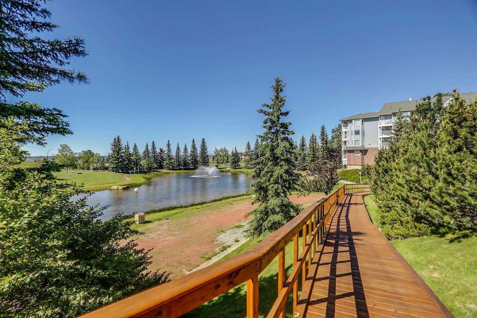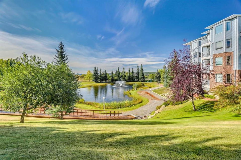 Dreamview Village – Hawkwood – #3213, 3000 Hawksbrow Point NW: This 937 sq ft end-unit is located in sought-after Dreamview Village. The 2 bedroom + 2 bathroom unit has new carpet throughout and includes one titled underground parking stall. This bright, open plan features a kitchen with a dishwasher, microwave, refrigerator, electric stove, and hood fan; an open dining area and living room with access to the extra-large 500+ sq ft private patio with BBQ gas hook up. The large primary bedroom has two closets and a spacious 3 pc ensuite with a glass shower; a 2nd bedroom, a 4 pc main bathroom, and a laundry room with a full-sized washer and dryer and storage complete this unit. Enjoy the views of a beautiful pond with a fountain on your way over to the clubhouse. Dreamview Village is a 55+ building with endless amenities including a guest suite, woodworking shop, library, billiards, clubhouse kitchen and patio, visitor parking & much more! Condo fees include heat, electricity, and water. Located in Hawkwood, conveniently located close to walking paths, easy access to Stoney Trail, John Laurie Blvd, and Crowchild Trail, and just minutes to the Crowfoot LRT station and Dalhouise LRT station. The building and the unit are well-maintained.and easy to show with quick possession available. Some photos have been virtually staged. Call for more info!