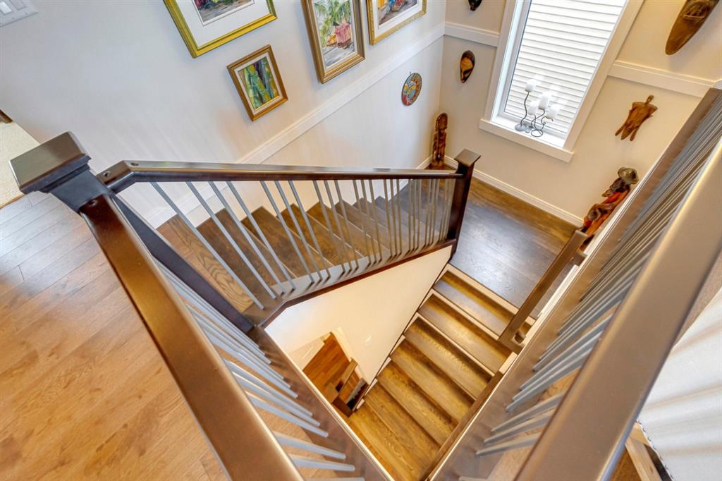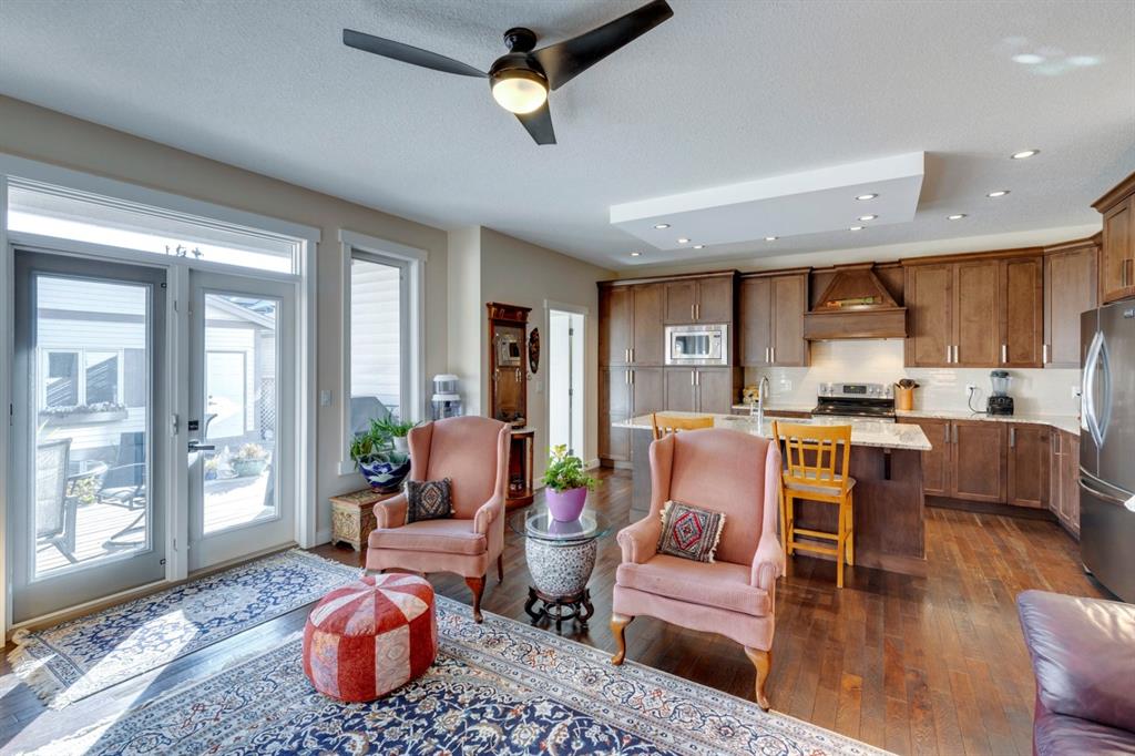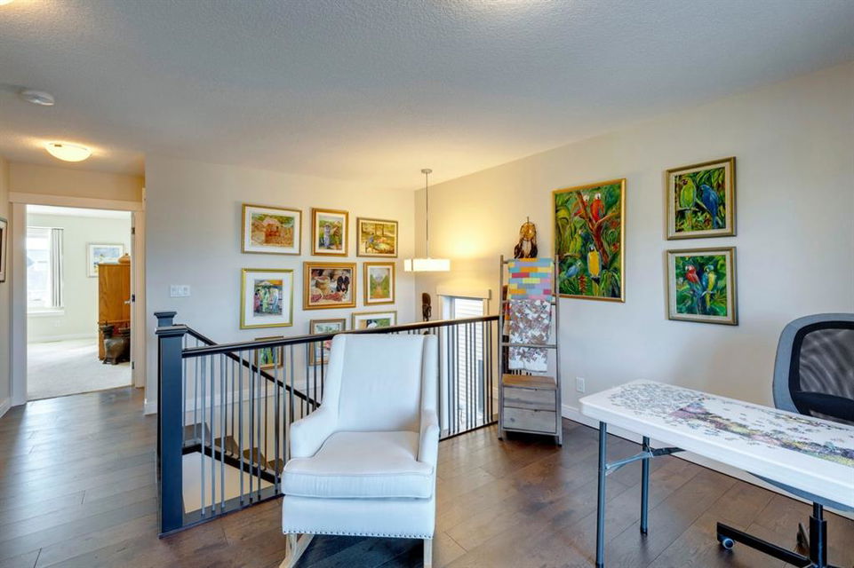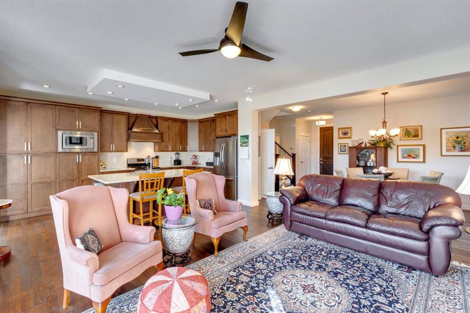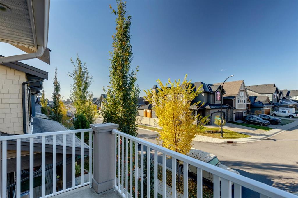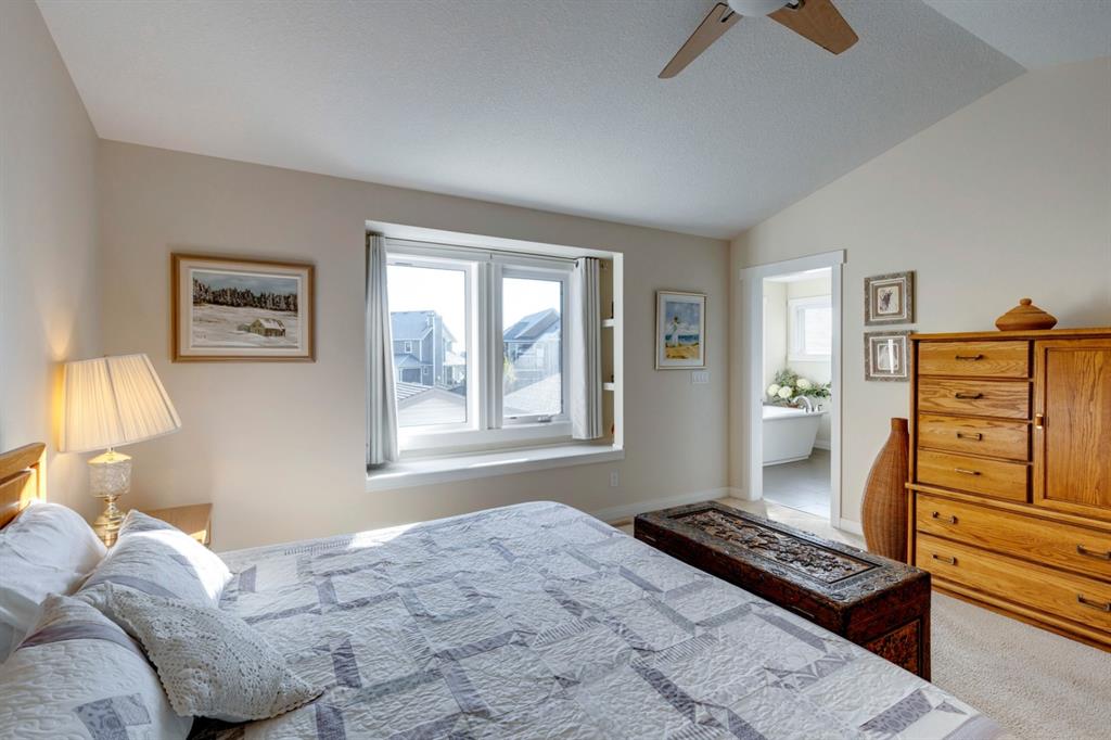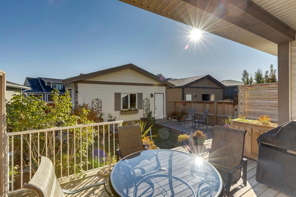 Coopers Crossing – 322 Cooperstown Common SW: Welcome to this fully developed 2,076 sq ft home in the sought after community of Coopers Crossing. This well-maintained home features 3 + 1 bedrooms, 2 full bathrooms, 2 half bathrooms, a fully developed lower level & detached double car garage with a paved back lane. The open floor plan features an upgraded kitchen with stainless steel appliances, built-in pantry, island with seating for 3; living room with gas fireplace and patio doors to the backyard/deck; dining room; spacious and bright den; 2-piece powder room and back door/mudroom with closet, hooks, bench and additional laundry hook ups. The upper level has a primary bedroom with vaulted ceilings, upgraded 5 pc ensuite and walk-in closet; two additional bedrooms; bonus room with glass doors to upper deck and 4-piece main bath. The developed lower level has a 4th bedroom, family room, 2-piece bathroom with laundry and workshop which can be converted to a 5th bedroom or additional living space. Great family home with low maintenance landscaping, turf throughout, backyard with garden oasis and 2-tiered deck; west-facing front porch with breathtaking front garden. This immaculate home shows pride of ownership, quality of construction and is steps away from parks, playgrounds, schools and a short drive to Calgary. Call for more info!