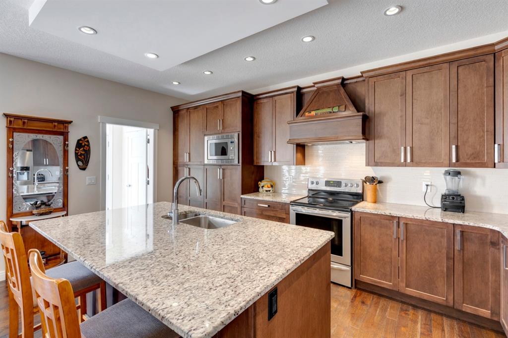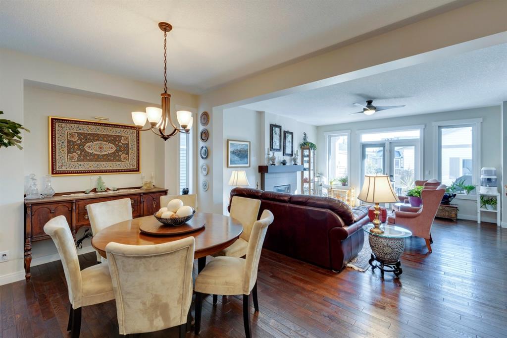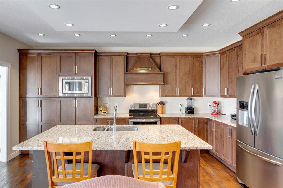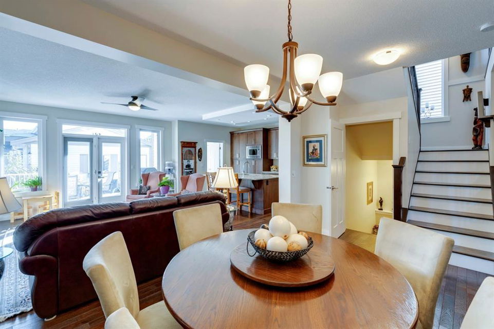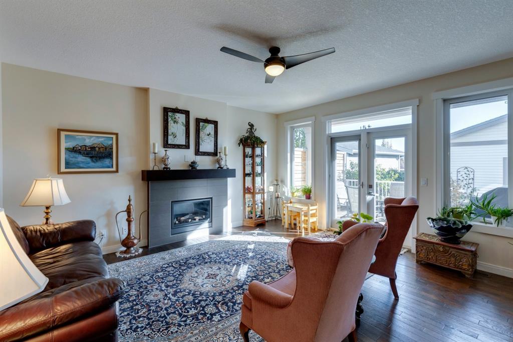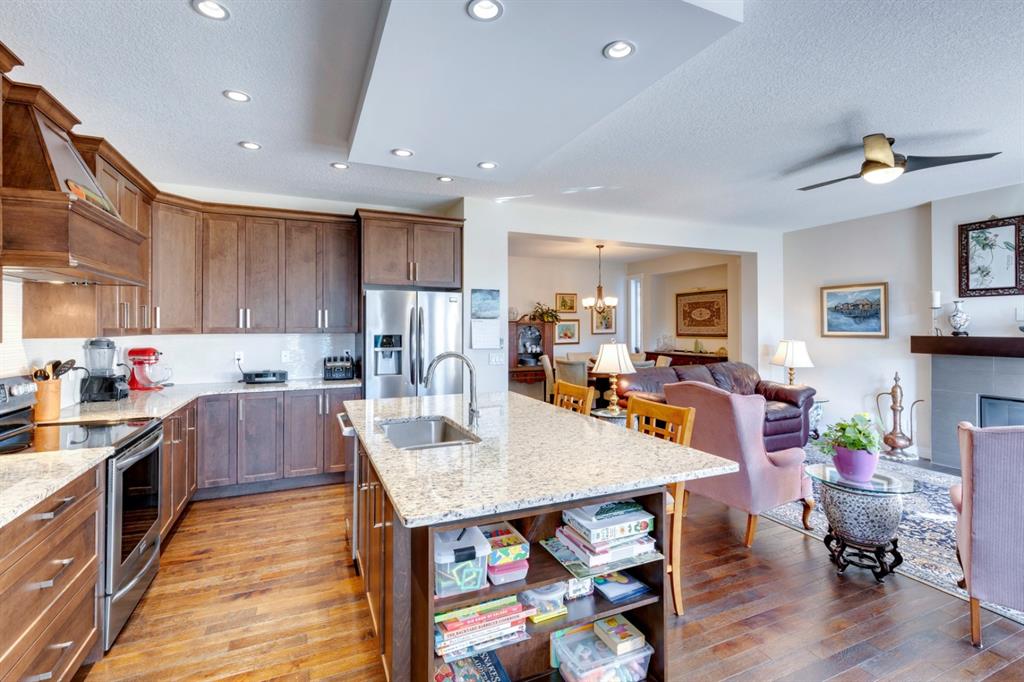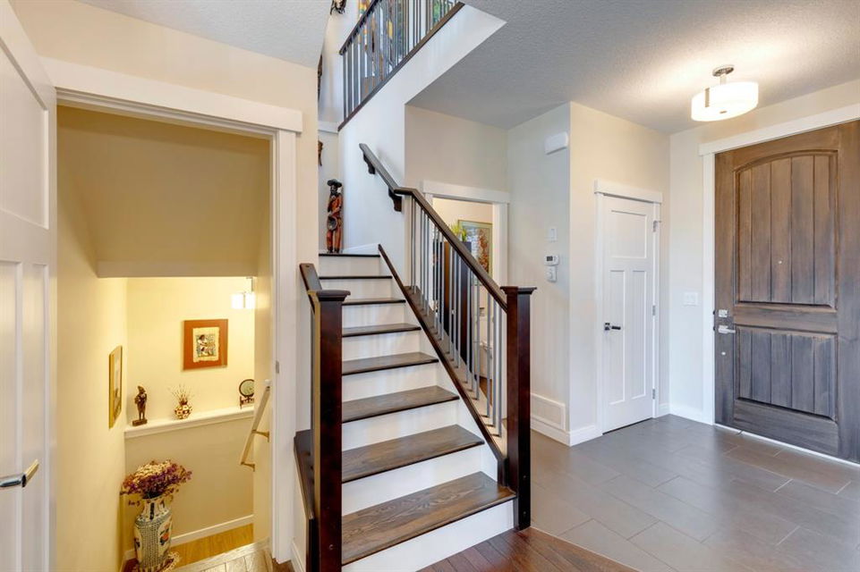 Coopers Crossing – 322 Cooperstown Common SW: Welcome to this fully developed 2,076 sq ft home in the sought after community of Coopers Crossing. This well-maintained home features 3 + 1 bedrooms, 2 full bathrooms, 2 half bathrooms, a fully developed lower level & detached double car garage with a paved back lane. The open floor plan features an upgraded kitchen with stainless steel appliances, built-in pantry, island with seating for 3; living room with gas fireplace and patio doors to the backyard/deck; dining room; spacious and bright den; 2-piece powder room and back door/mudroom with closet, hooks, bench and additional laundry hook ups. The upper level has a primary bedroom with vaulted ceilings, upgraded 5 pc ensuite and walk-in closet; two additional bedrooms; bonus room with glass doors to upper deck and 4-piece main bath. The developed lower level has a 4th bedroom, family room, 2-piece bathroom with laundry and workshop which can be converted to a 5th bedroom or additional living space. Great family home with low maintenance landscaping, turf throughout, backyard with garden oasis and 2-tiered deck; west-facing front porch with breathtaking front garden. This immaculate home shows pride of ownership, quality of construction and is steps away from parks, playgrounds, schools and a short drive to Calgary. Call for more info!