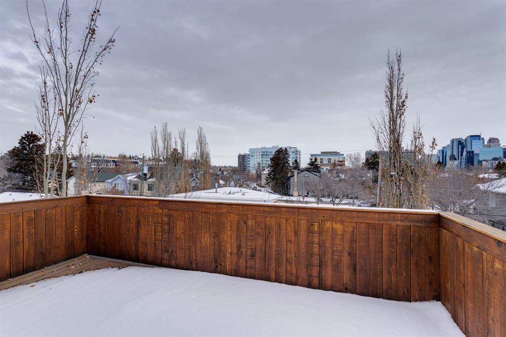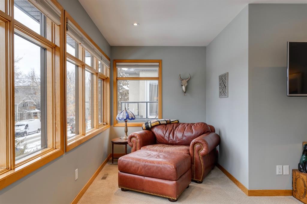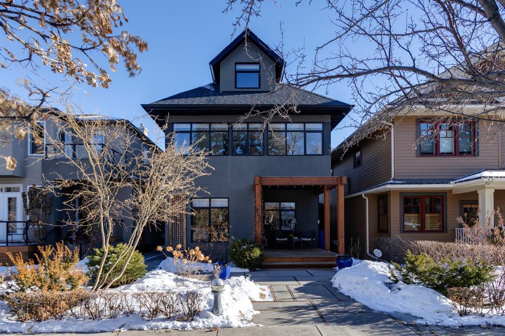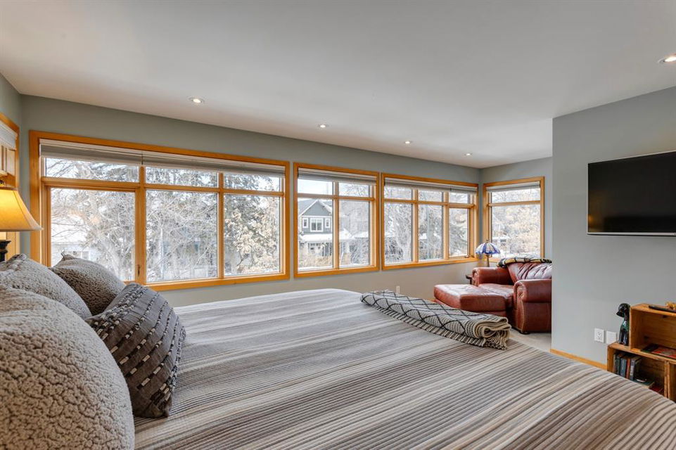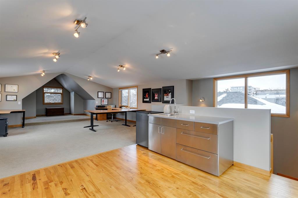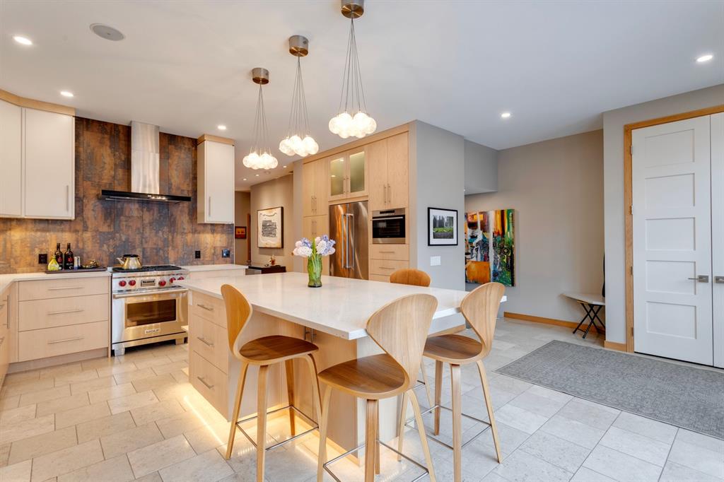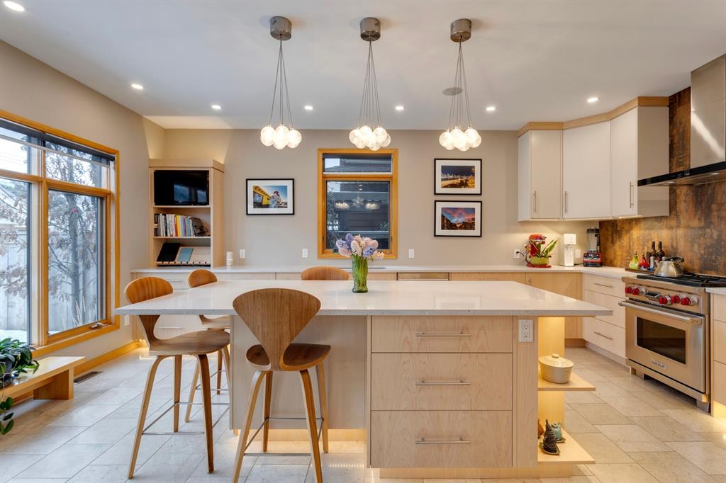 Hillhurst – 410 11A Street NW: Look no further than this immaculately maintained, 2.5-storey home with over 4,100 sqft of development located on one of the most desirable streets in the heart of Kensington. This home has a total of 5 bedrooms and 3.5 baths. Step inside and be greeted by the living room and formal dining room, both separated by a 2-sided fireplace. The heart of the home is the stunning, renovated kitchen that features a large island with seating for 4, quartz countertops, and a suite of high-end stainless steel appliances including a Wolf gas range, hood fan, and convection steam oven, as well as a Kitchen-Aid refrigerator and Blomberg dishwasher. Also on the main floor, you’ll find a serene meditation/quiet room and a large half bath for your guests’ convenience. The 2nd level includes a spacious, bright primary bedroom with a seating area, walk-in closet, 5 pc ensuite with heated floors, dual sinks, and dual shower heads; 2 additional bedrooms – 1 with a walk-in closet; 4 pc main bathroom with a claw tub; and a spacious laundry room with a sink, folding table, and plenty of storage. The 3rd level features a spacious loft area that can be used as a bonus room, office, or workout area with a wet bar and a balcony overlooking the backyard with downtown views. The fully developed lower level boasts a massive wet bar with 2 Sub-Zero wine fridges, a beverage fridge, tons of storage cupboards and cork floor; a rec room with tray ceilings; 2 additional bedrooms and a 4 pc bath with heated floors. Additional features of the home include a heated double-car garage, low-maintenance landscaping, built-in speakers throughout, and a 30’ x 125’ lot located on a quiet, tree-lined street. You’ll be just a short walk from Kensington’s shops & restaurants and minutes from downtown, the Bow River pathway, schools, and parks. Don’t wait, call for more info and schedule your private showing today!