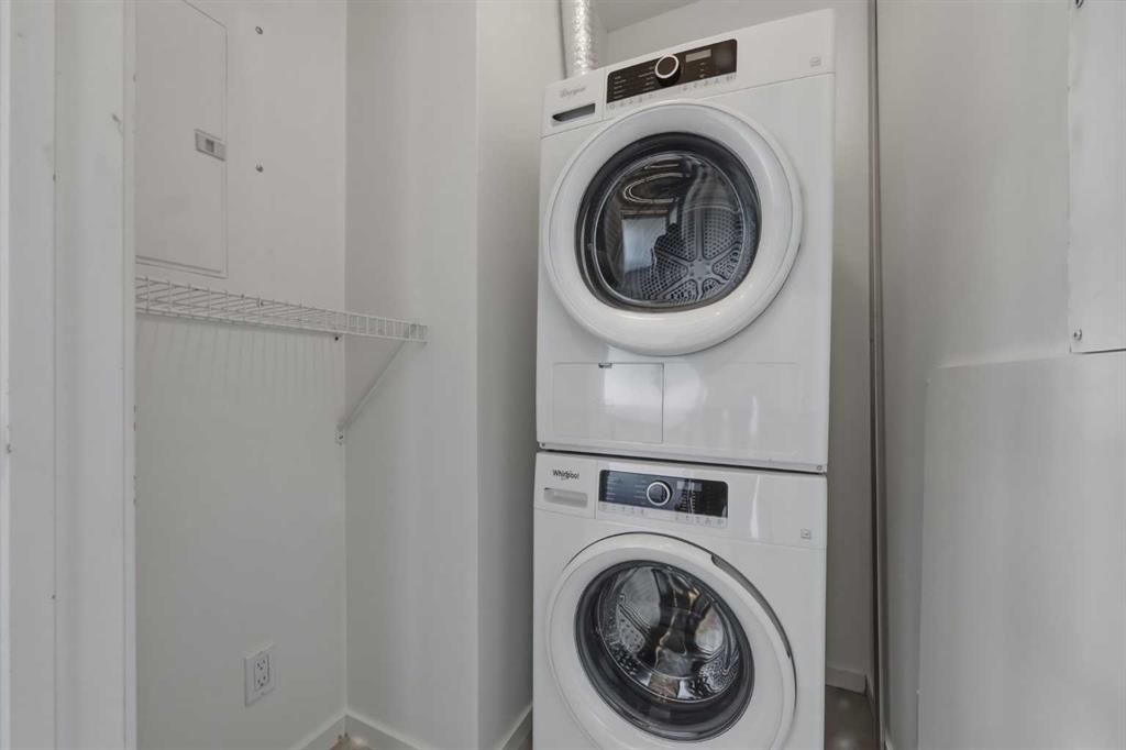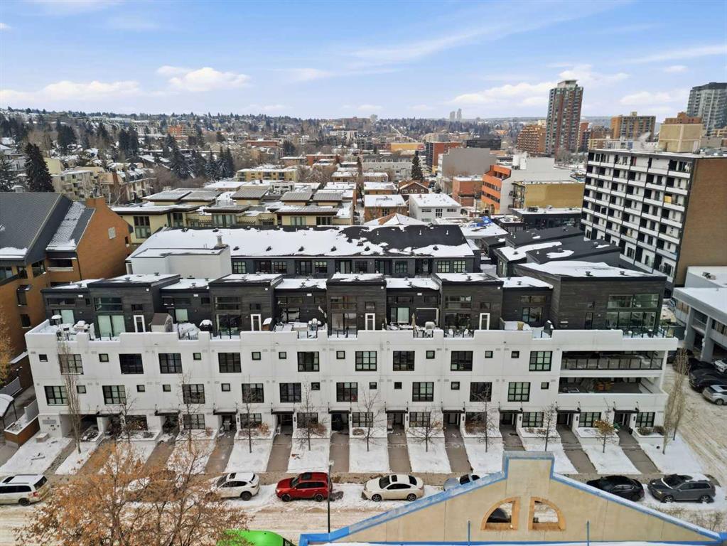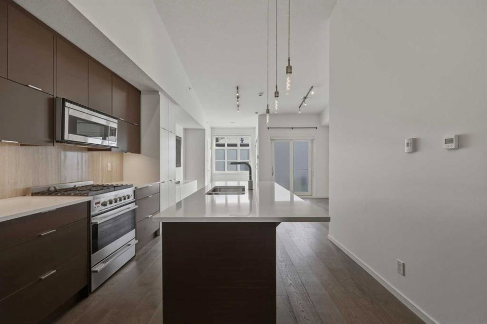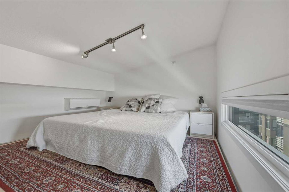 Lower Mount Royal – #433, 1719 9A Street SW: Welcome to The Block built by Avi Urban. This modern, TOP FLOOR unit offers 612 sq ft of living space plus a 99 sq ft loft (not included in measurements due to ceiling height), 1 bedroom, 1 bathroom, and titled underground parking. The bright entry opens to a vaulted living area with room for both living and dining, along with sliding doors leading to the patio overlooking the courtyard. The kitchen features quartz countertops, tile backsplash, a pantry, and stainless steel appliances, including a gas range, fridge, dishwasher, and microwave. The impressive 13-foot ceiling height in the primary bedroom has been transformed into a unique lofted feature designed by Calgary’s Studio North, creating a space that is both practical and distinctive. Thoughtfully redesigned, the bedroom offers a flexible layout with a walk-in closet, home office/fitness space on the main level, complemented by the private lofted sleeping area. Additional highlights include hardwood flooring throughout, in-suite laundry, air conditioning, and separate storage in the underground parkade. Ideally located in the vibrant community of Lower Mount Royal, just half a block from the energy of 17th Avenue, this home offers an exceptional walkable lifestyle with shops, restaurants, cafes, amenities, and public transit all just steps from your door. This cool, unique space is a must-see. Turn key with quick possession available.