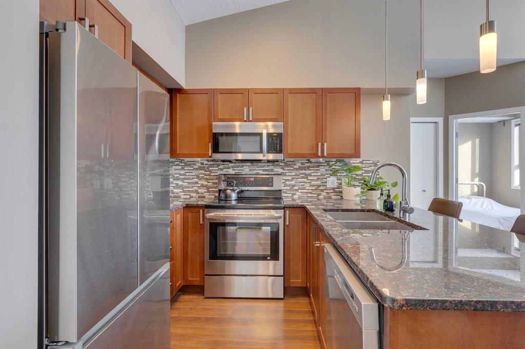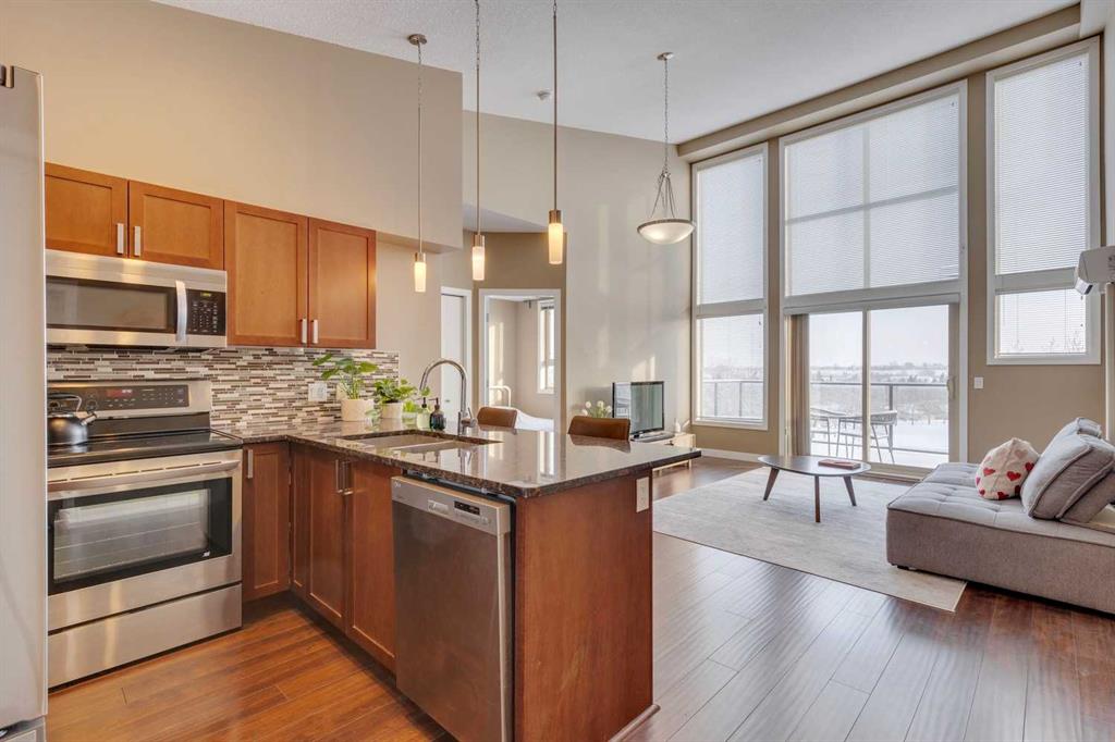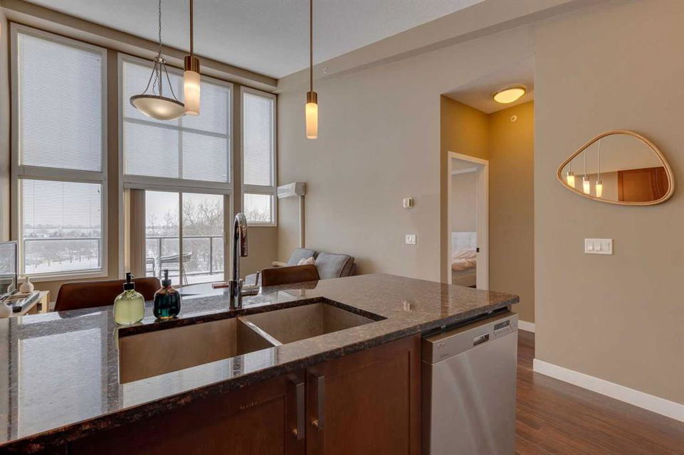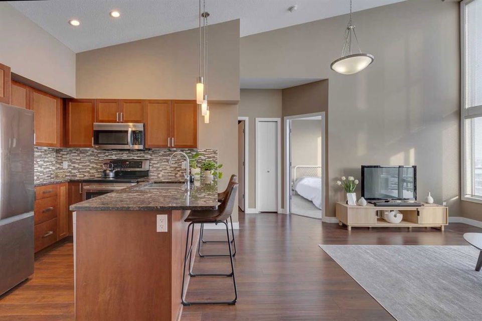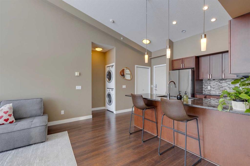 Highland Park – #532, 4303 1 Street NE: This exquisite vaulted top floor unit features 829 sq ft, 2 bedrooms, 2 full bathrooms and a den. Step into the living room, where vaulted ceilings create an airy, spacious atmosphere, complemented by an abundance of natural light that bathes the entire space. The open-concept layout, connecting the living room to the well-appointed kitchen with stainless steel appliances, granite countertops and breakfast bar provides seating for 3. The primary bedroom is a true retreat, featuring a walk-thru closet and an ensuite bathroom for a touch of luxury. The second bedroom is equally inviting, providing flexibility for guests or a home office. Additional features of this unit are an in-wall air conditioner (A/C), in-suite laundry, underground parking stall and storage locker. Located in Highland Park offering an excellent central location just steps away from a park, off-leash dog area, schools, and public transportation + quick access to major traffic routes. Call for more info!