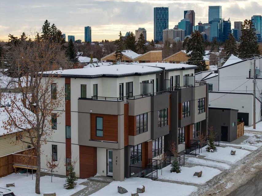 Mount Pleasant – New Price! 741 21 Avenue NW: Welcome to this beautiful townhome offering 3 bedrooms, 4.5 bathrooms, a single-car garage, and over 2,100 sq ft of developed living space. Designed by respected Calgary architect John Trinh and Associates, this project showcases high-level craftsmanship, thoughtful material selection, and exceptional attention to detail throughout. The main floor features a spacious front entry, a bright living room with an electric fireplace and built-in shelving, and a central kitchen complete with stainless steel appliances, an island with seating, a pantry cupboard, and a dining area with access to the deck. A convenient two-piece powder room completes this level. The second floor offers two generously sized bedrooms, each with its own ensuite, one with a four-piece bathroom and the other with a three-piece. A well-equipped laundry room with cabinets, a sink, and a folding counter adds everyday convenience. The entire third level is dedicated to the primary retreat, featuring exclusive access to the top-floor balcony, a walk-in closet, and a luxurious five-piece ensuite with dual sinks, a soaker tub, and a walk-in shower. The lower level features open studio-style legal suite with a private entrance, its own full kitchen equipped with stainless steel appliances, a comfortable living area, and a four-piece bathroom. 4 Units are Available! Ideally located in the heart of Mount Pleasant, one of Calgary’s most desirable mature communities, this home offers easy access to Confederation Park, SAIT, and the University of Calgary. Enjoy a quick commute to downtown along with nearby transit routes on 4 Street, Centre Street, and 20 Avenue, plus a great selection of local restaurants and coffee shops.